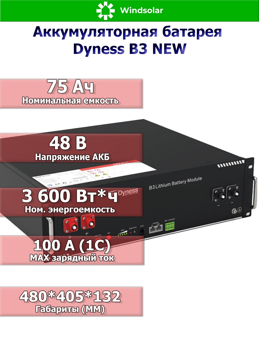 Аккумуляторная батарея Dyness B3 снабжена встроенной системой управления (BMS), способной отслеживать состояние электрических элементов батареи, включая такие характеристики, как напряжение, температура, сила тока и так далее. АКБ Dyness В3 не требуют много места и безопасны для размещения в жилых помещениях, а также могут использоваться как отдельно, так и при параллельном включении с целью увеличения емкости системы для различных нужд – до 40шт c общей энергоемкостью 144 кВт*ч.