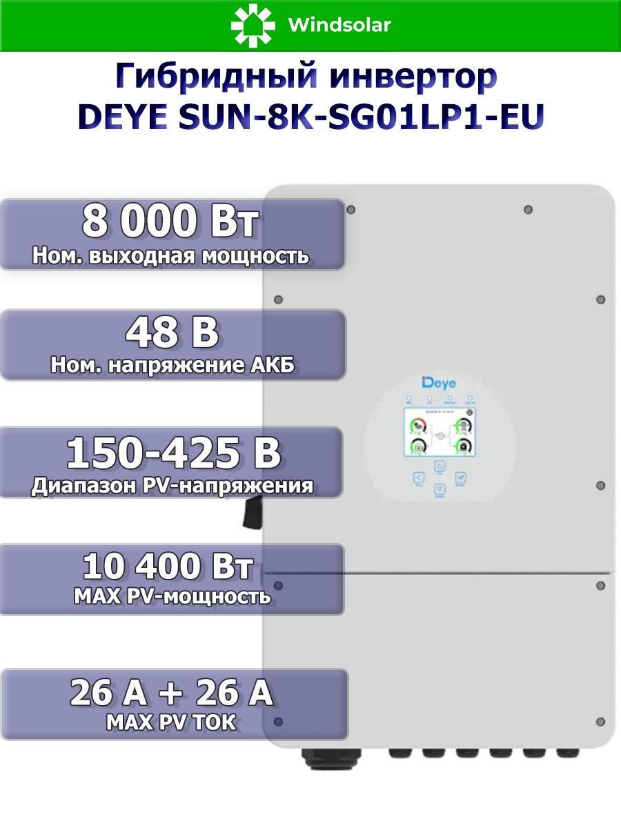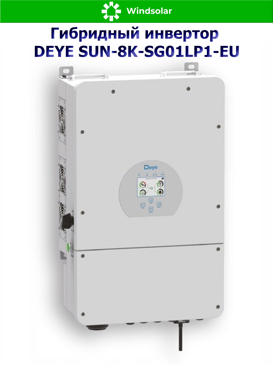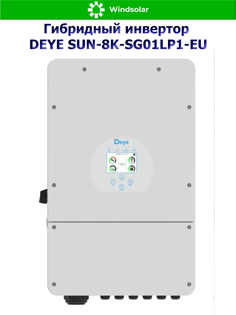 Гибридный однофазный инвертор DEYE SUN-8K-SG01LP1-EU от компании Deye Inverter Technology Co, это не просто современный и высокоэффективный инвертор, а настоящая многофункциональная система, в которой сочетаются функции инвертора, контроллера заряда АКБ от солнечных панелей и зарядного устройства АКБ от сети 220В для обеспечения бесперебойной подачи питания, с возможностью выбора приоритетов зарядки и нагрузки. Используется не только совместно с городской сетью, но и автономном режиме (при временном отключении сети или в ее отсутствии, в принципе).