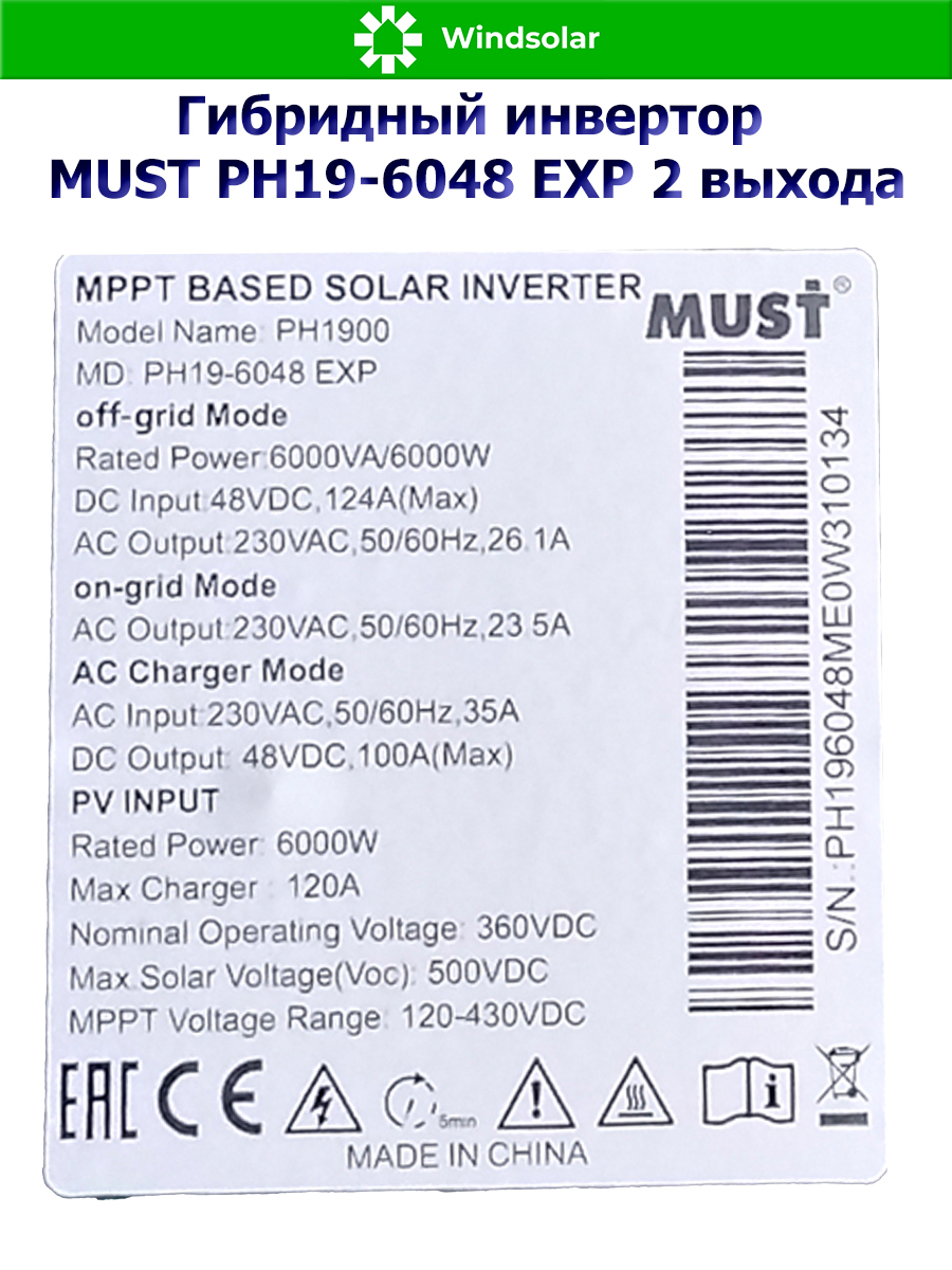 Гибридный солнечный инвертор MUST PH19-6048 EXP 2 выхода - это высокотехнологичное устройство, предназначенное для преобразования энергии солнечных панелей и аккумуляторов в стабильное электричество для использования в бытовых и промышленных целях.