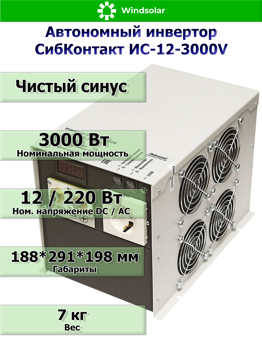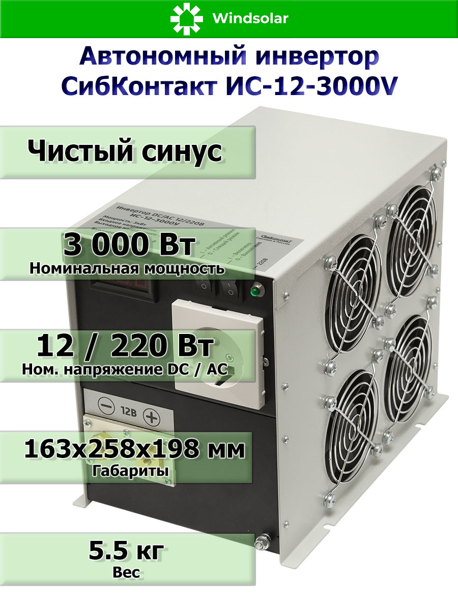 ИС-12-3000V - это инвертор широкого применения. Синусоидальное напряжение позволяет подключать к инвертору любое оборудование, рассчитанное на работу от переменного напряжения 220В и частотой 50 Гц: