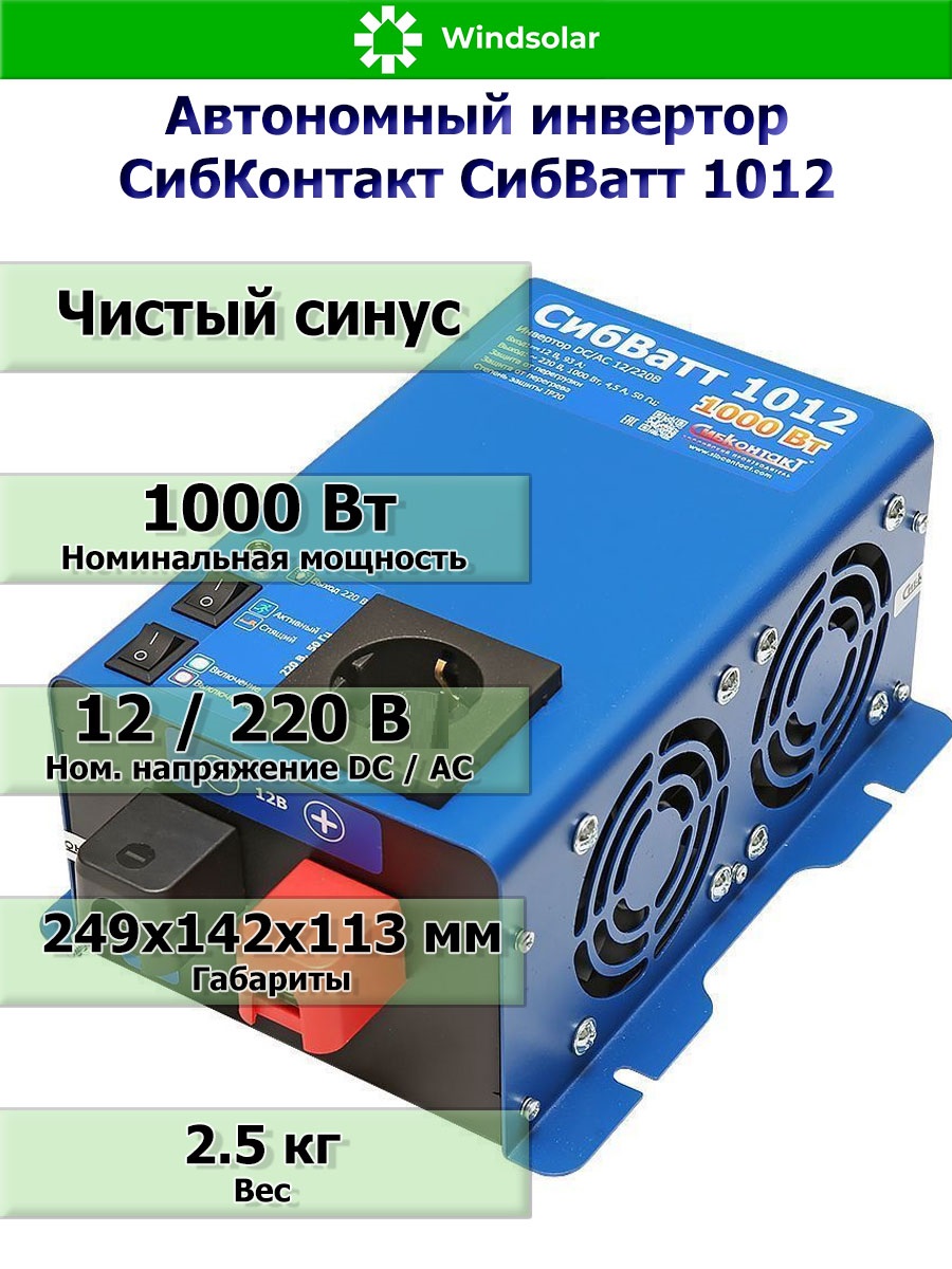 Инвертор СибВатт 1012 (преобразователь напряжения) преобразует постоянное напряжение аккумулятора 12 В в переменное синусоидальное напряжение 220 В и частотой 50 Гц. Качественные характеристики такого напряжения аналогичны характеристикам напряжения в бытовой сети.