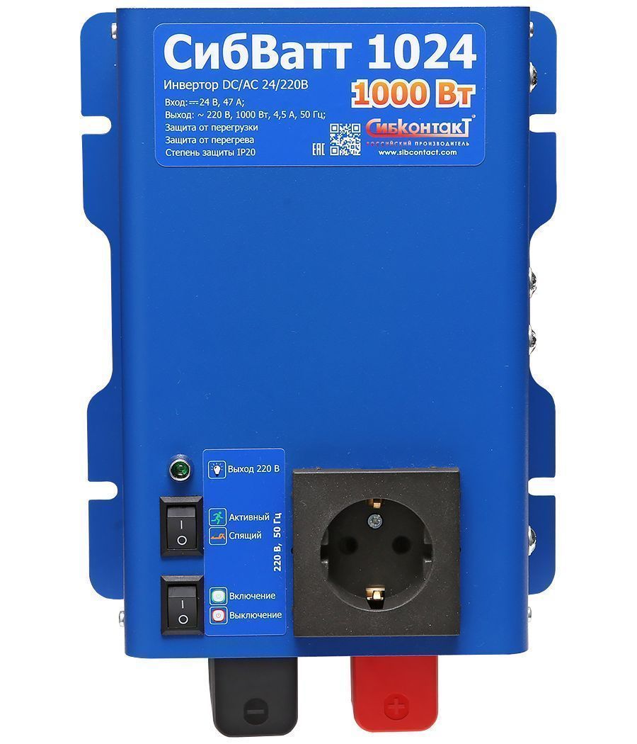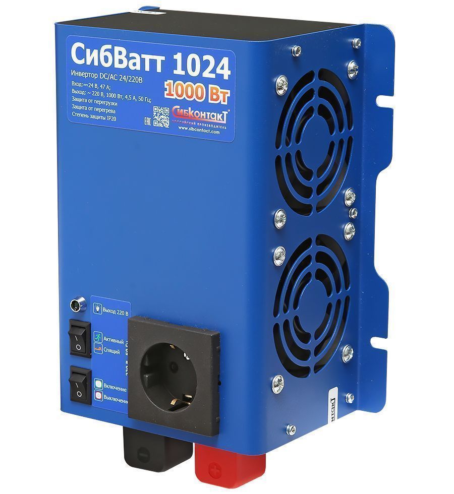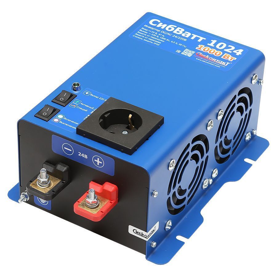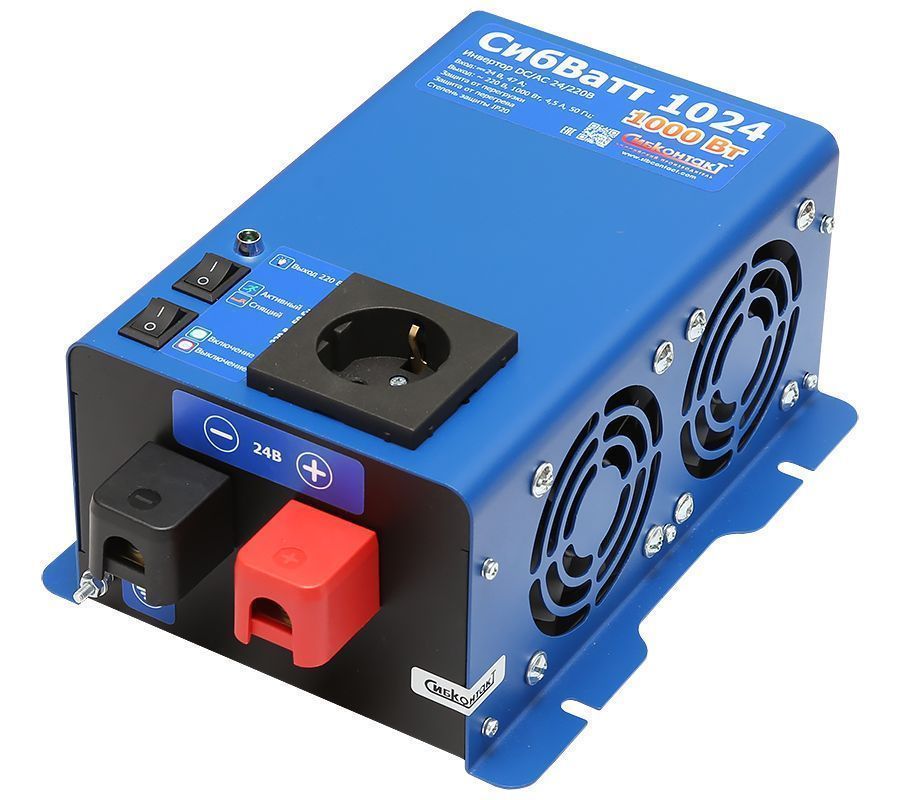 Инвертор СибВатт 1024 (преобразователь напряжения) преобразует постоянное напряжение аккумулятора 24 В в переменное синусоидальное напряжение 220 В и частотой 50 Гц. Качественные характеристики такого напряжения аналогичны характеристикам напряжения в бытовой сети.