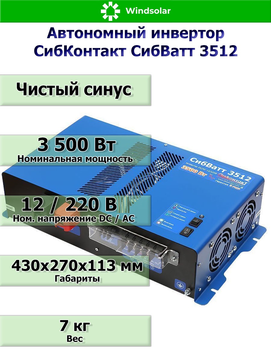 Инверторы серии СибВатт отличаются высокой надежностью и электробезопасностью. Они подходят для работы с разными типами аккумуляторных батарей - свинцовыми, никель-кадмиевыми, литий-ионными и другими. Подходят для использования в системах резервного и альтернативного электропитания (солнечная и ветровая энергия).
