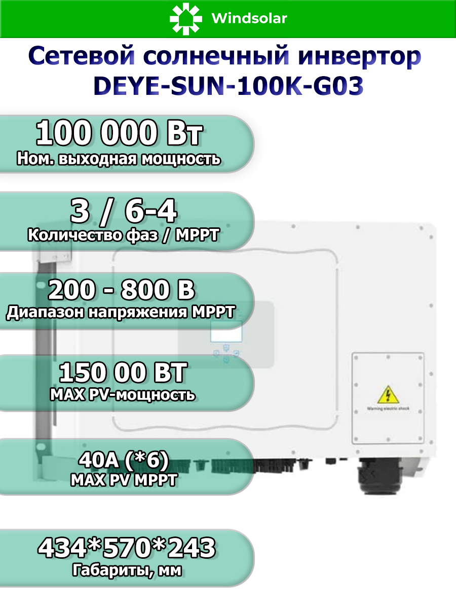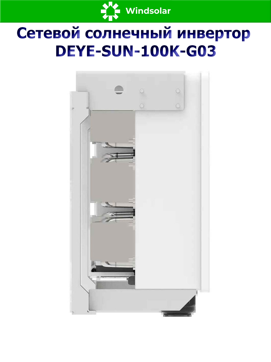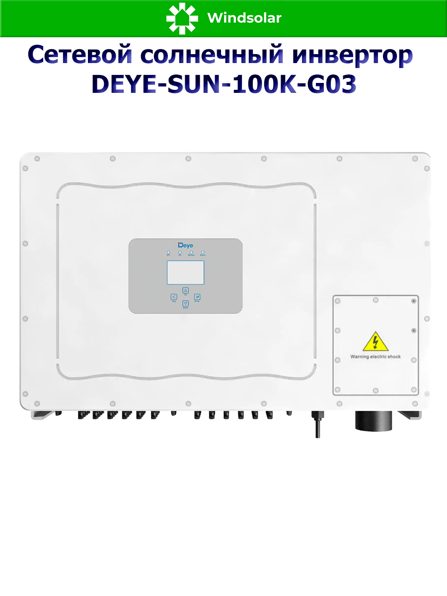 Сетевой трехфазный инвертор Deye SUN-100K-G03 от компании Deye Inverter Technology Co. - это передовое решение в области преобразования солнечной энергии, которое сочетает в себе высокую эффективность, надежность и удобство использования. Этот инвертор предназначен для работы только совместно с городской сетью и оснащен MPPT контроллерами заряда, что позволяет оптимально использовать энергию солнечных панелей.