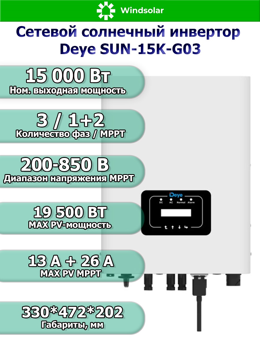 Сетевой трехфазный инвертор Deye SUN-15K-G03 от компании Deye Inverter Technology Co. - это передовое решение в области преобразования солнечной энергии, которое сочетает в себе высокую эффективность, надежность и удобство использования. Этот инвертор предназначен для работы только совместно с городской сетью и оснащен MPPT контроллерами заряда, что позволяет оптимально использовать энергию солнечных панелей.