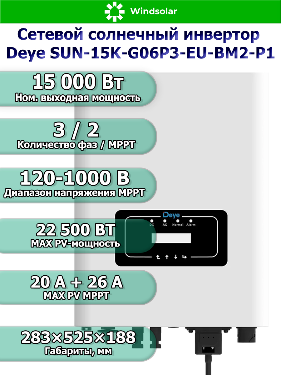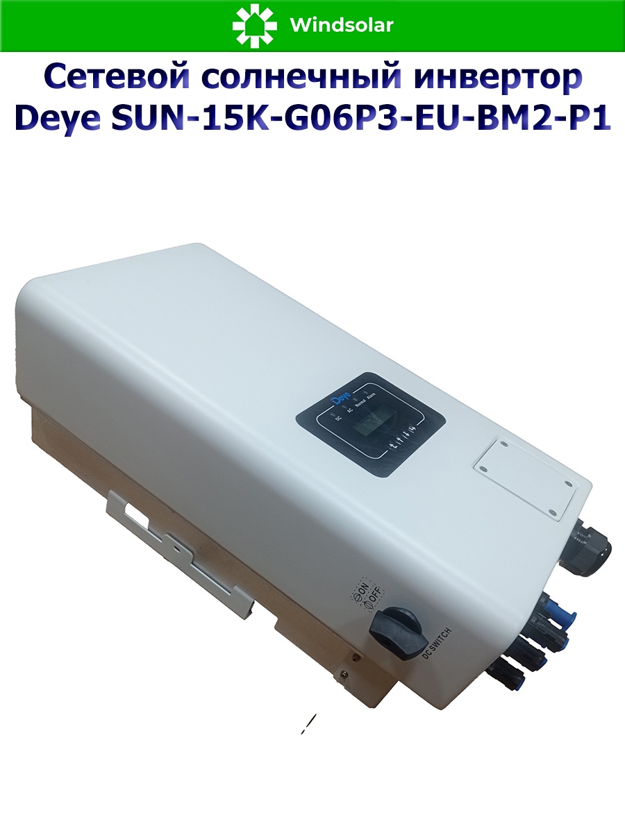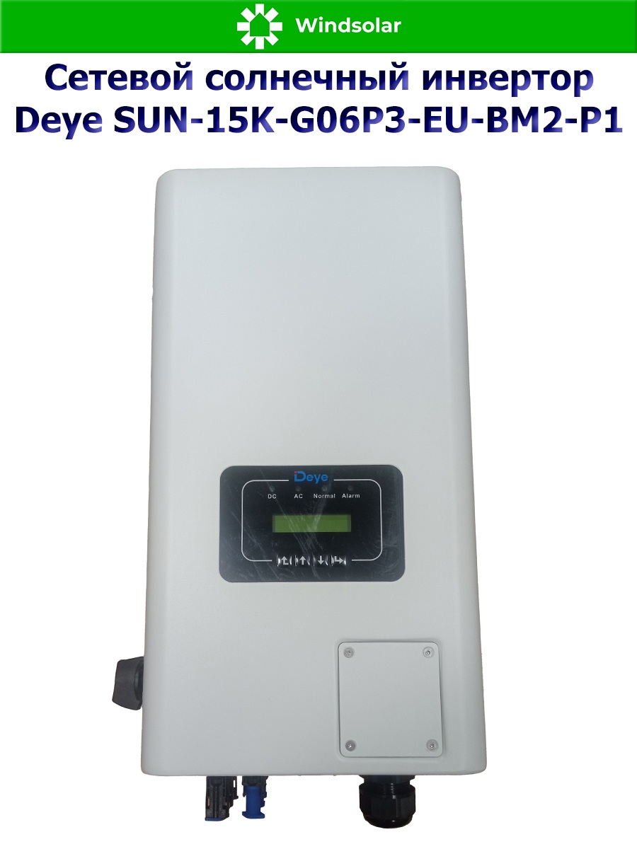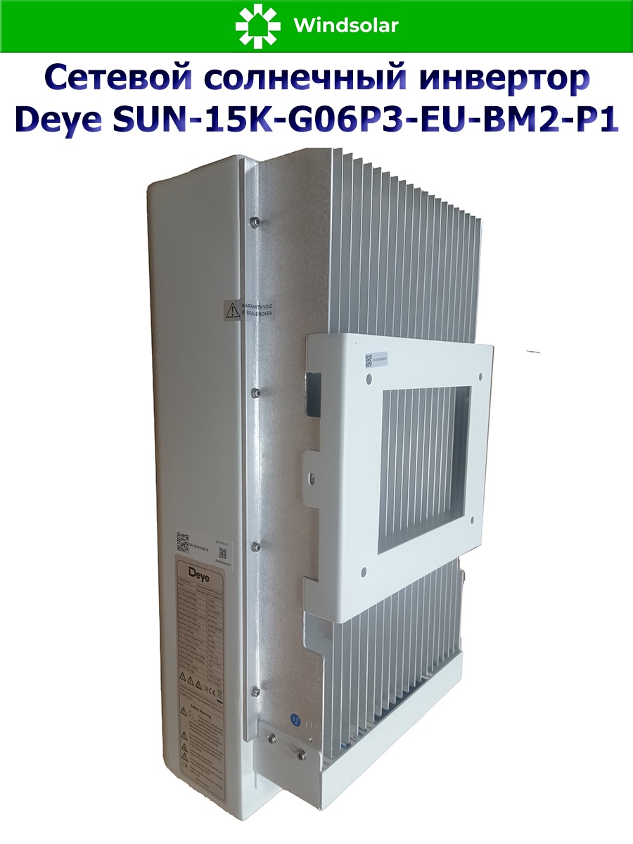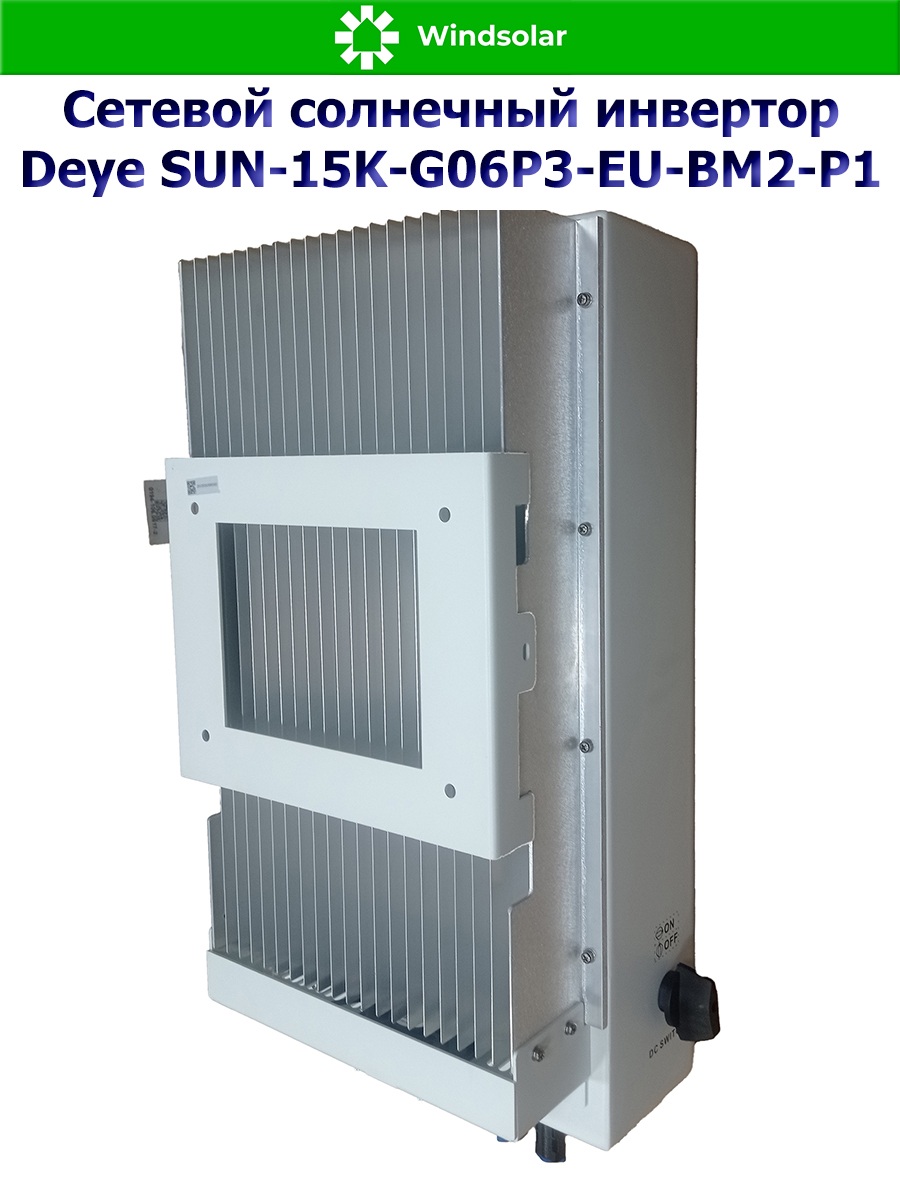 Сетевой трехфазный инвертор Deye SUN-15K-G06P3-EU-BM2-P1 от компании Deye Inverter Technology Co*, это современный и высокоэффективный инвертор с MPPT контроллерами заряда, который используется только совместно с городской сетью: принцип его работы заключается в преобразовании солнечной энергии в переменный ток и ее подмешивании в сеть для обеспечения дополнительной нагрузки или экономии. Данная модель инвертора подходит для построения объектов микрогенерации.