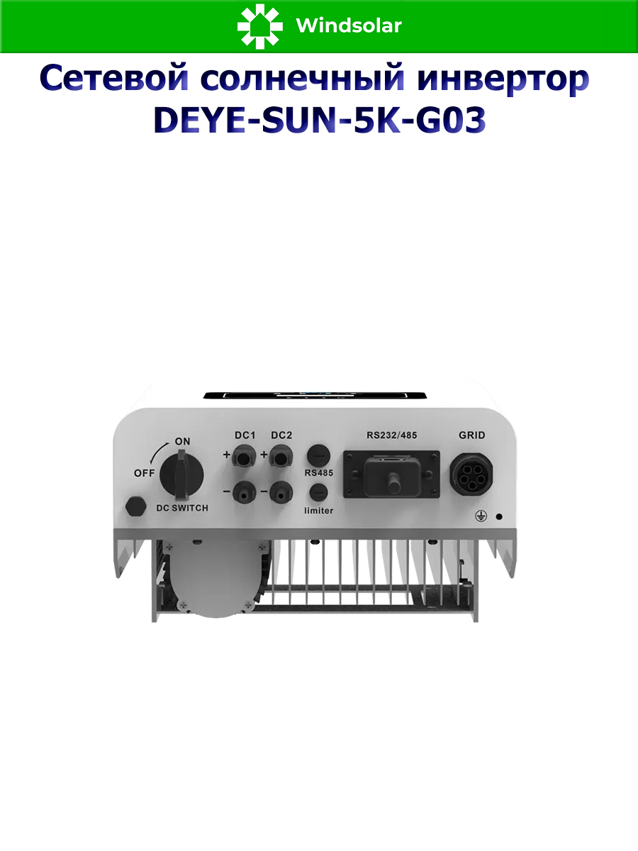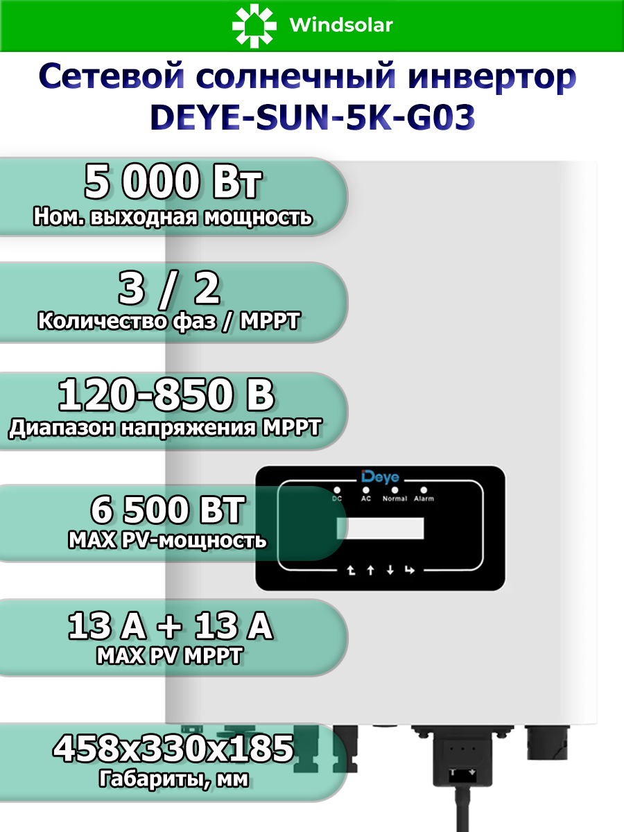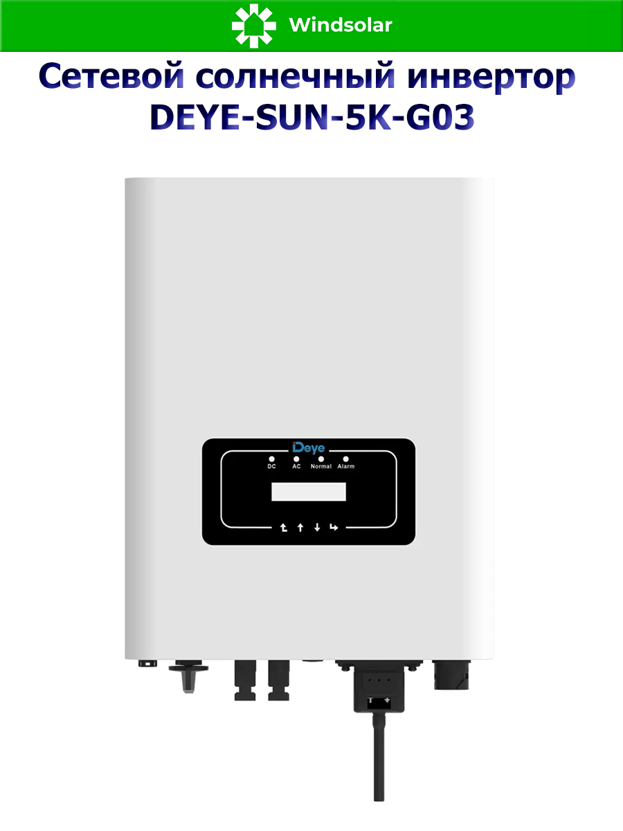 Сетевой трехфазный инвертор Deye SUN-5K-G03 от компании Deye Inverter Technology Co. - это передовое решение в области преобразования солнечной энергии, которое сочетает в себе высокую эффективность, надежность и удобство использования. Этот инвертор предназначен для работы только совместно с городской сетью и оснащен MPPT контроллерами заряда, что позволяет оптимально использовать энергию солнечных панелей.