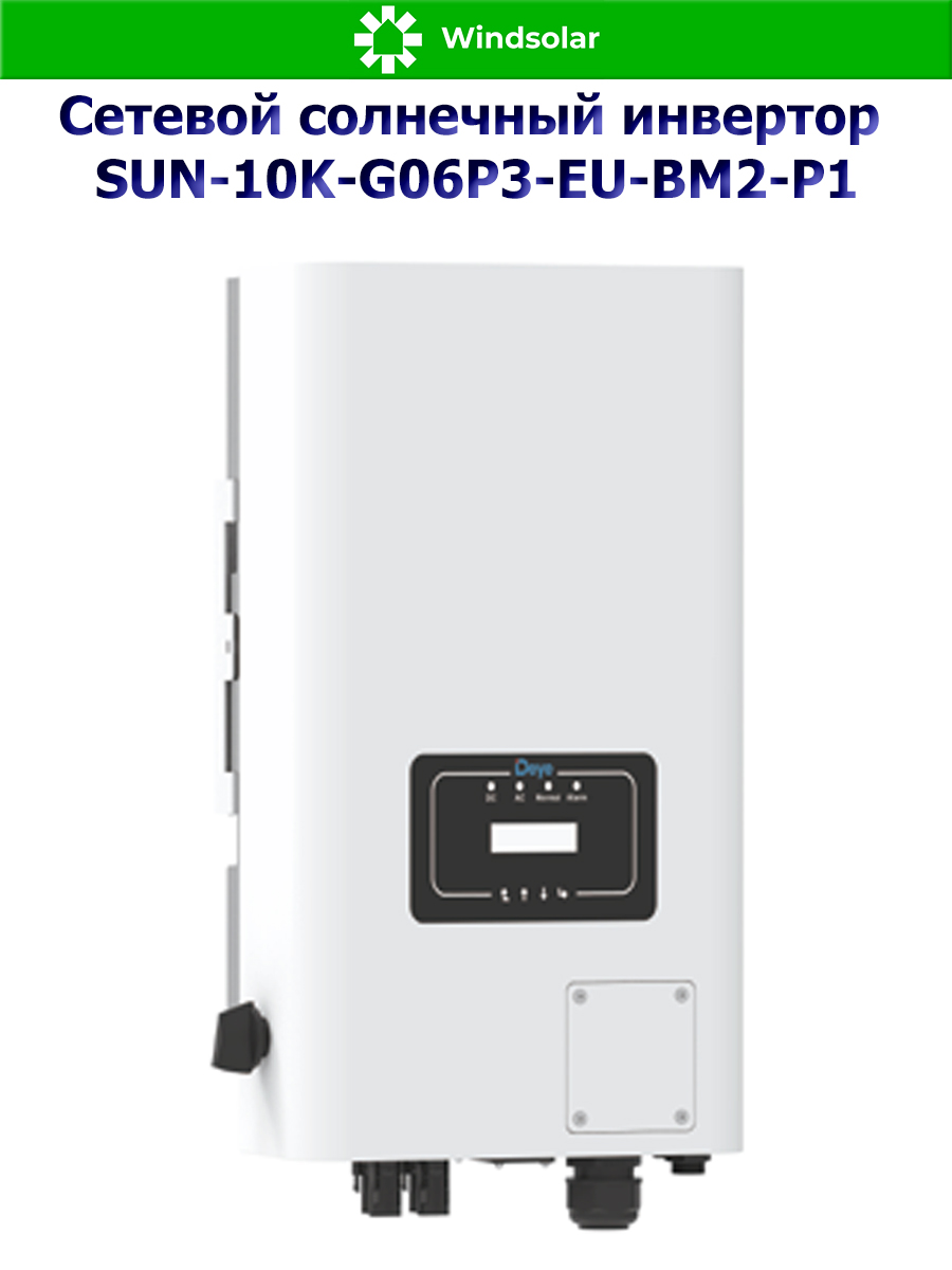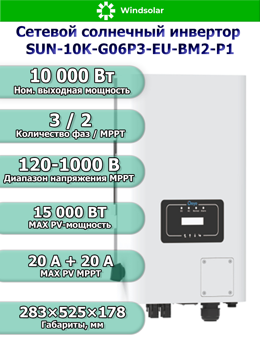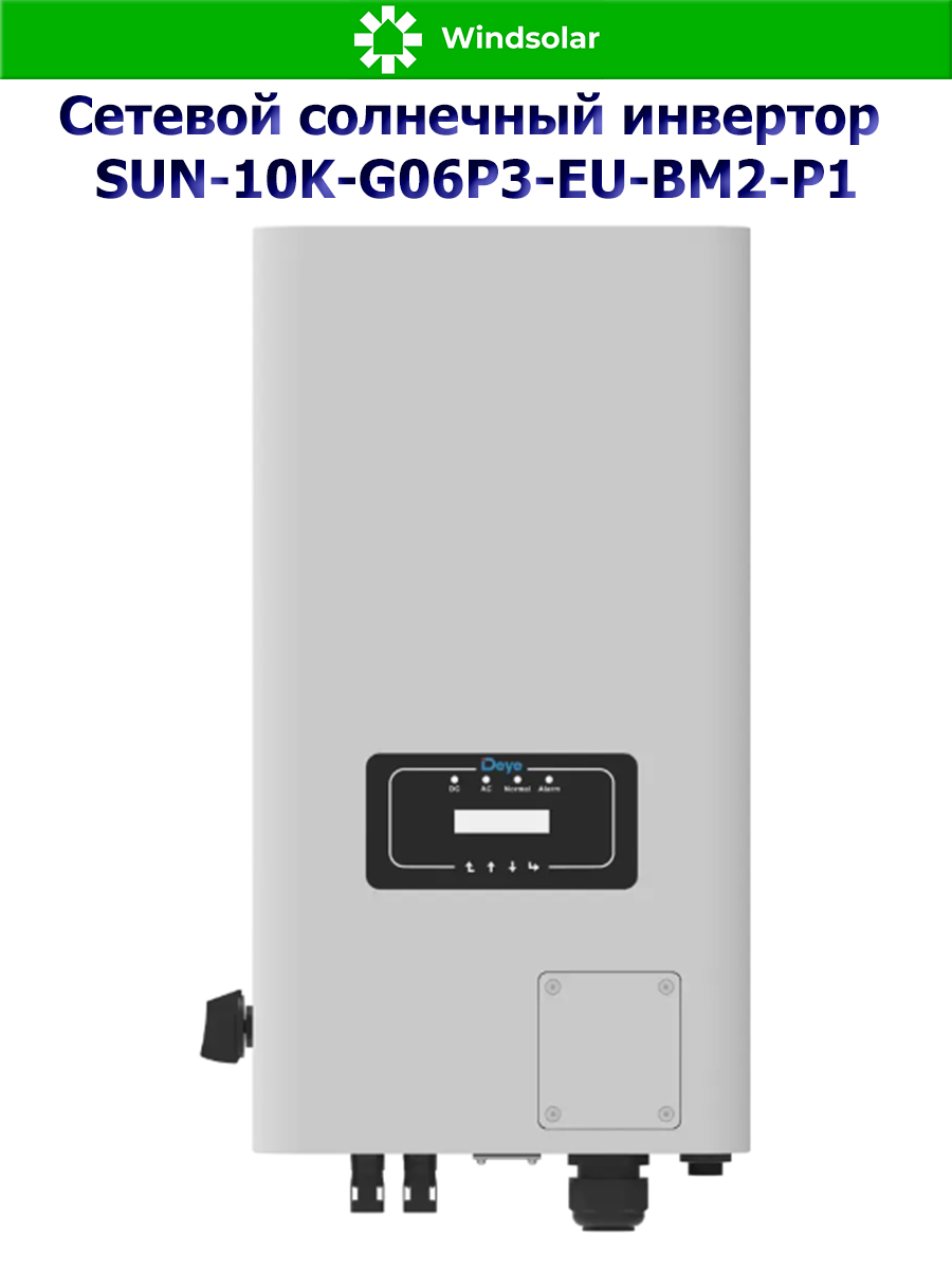 Сетевой трехфазный инвертор Deye SUN-10K-G06PЗ-EU-BM2-P1 от компании Deye Inverter Technology Co*, это современный и высокоэффективный инвертор с MPPT контроллерами заряда, который используется только совместно с городской сетью: принцип его работы заключается в преобразовании солнечной энергии в переменный ток и ее подмешивании в сеть для обеспечения дополнительной нагрузки или экономии. Данная модель инвертора подходит для построения объектов микрогенерации.