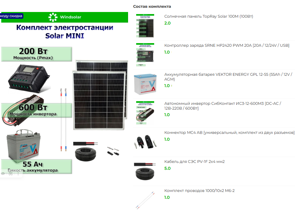 Комплектация комплекта солнечной электростанции на 200 Вт