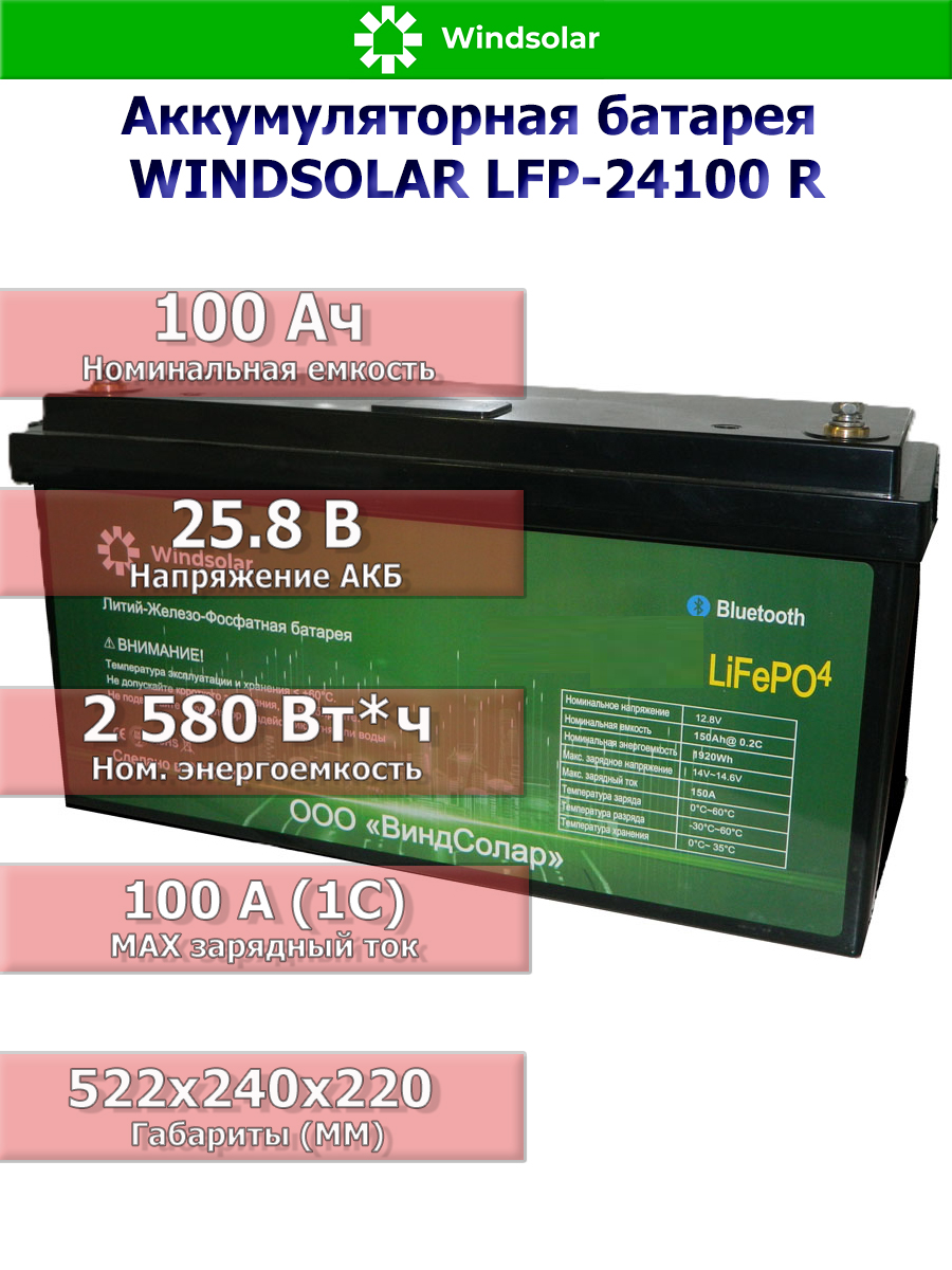WINDSOLAR LFP Smart BLOCK 24V 100AH — это не просто АКБ, а высокотехнологичное решение, разработанное с учётом суровых российских условий эксплуатации.
