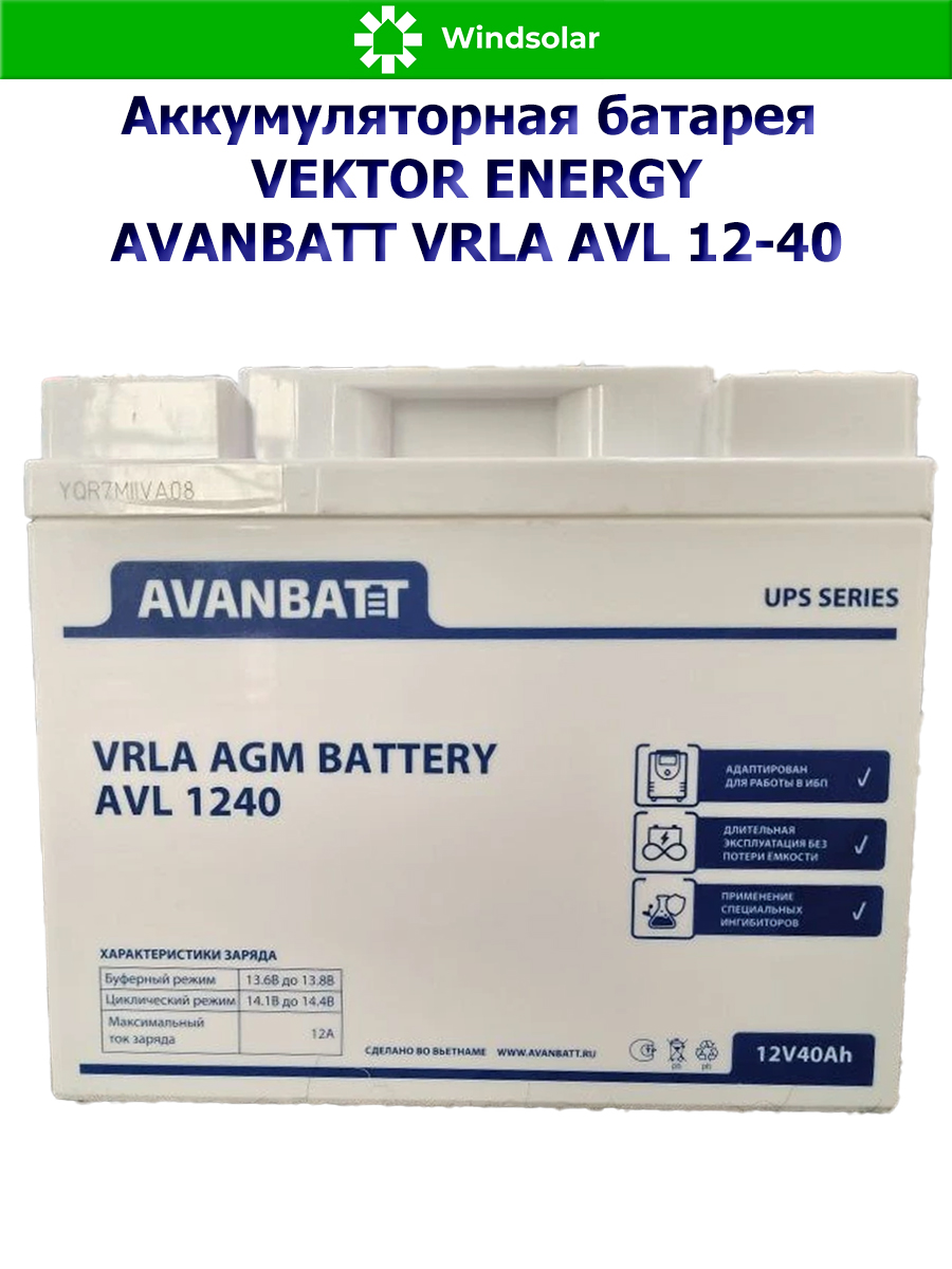 Аккумуляторная батарея AVANBATT VRLA AVL 12-40 представляет собой герметичную свинцово-кислотную батарею, выполненную по технологии AGM. Номинальное напряжение составляет 12 В, номинальная емкость — 40 А·ч (при 10-часовом режиме разряда).
