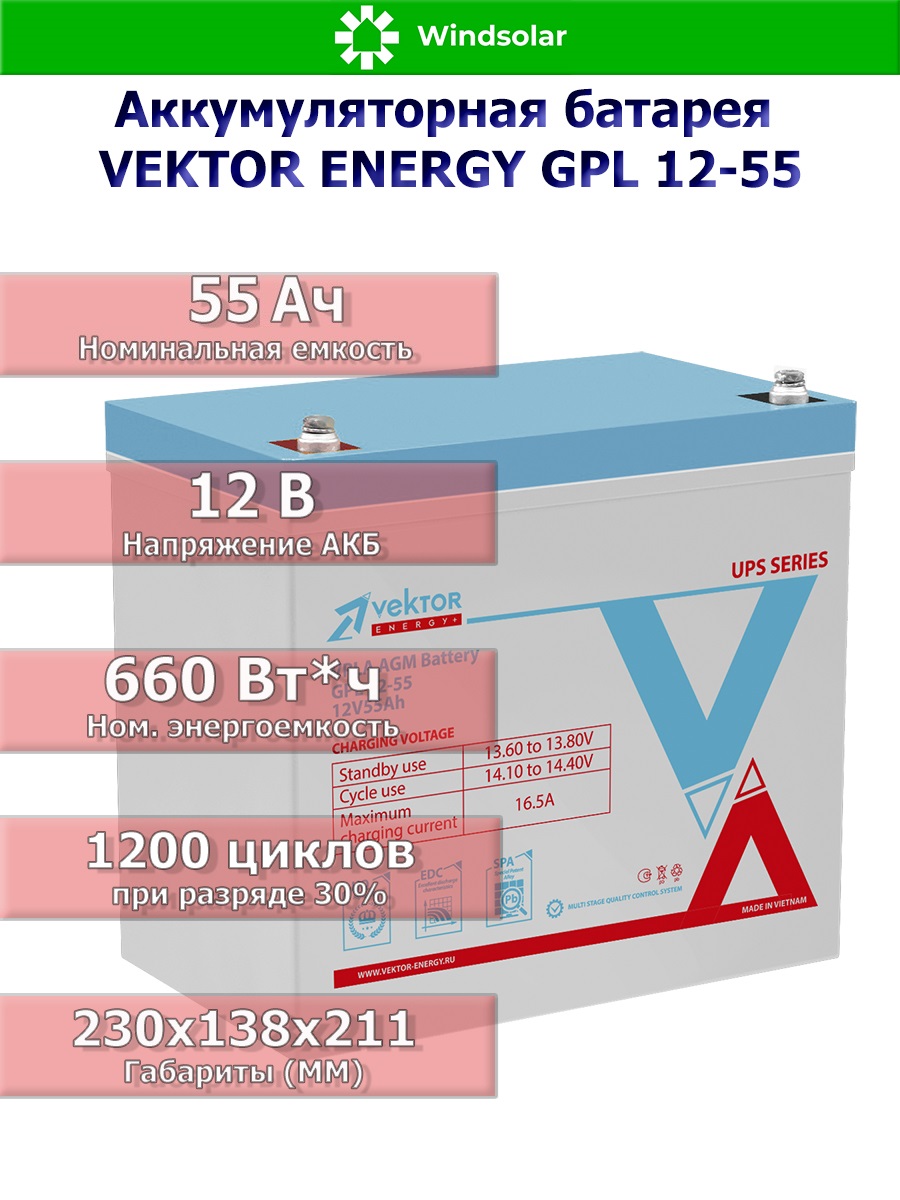 Аккумуляторная батарея VEKTOR ENERGY GPL 12-55 является превосходным выбором для тех, кто ищет надежный и долговечный источник питания для своей техники.