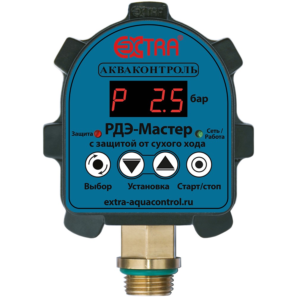 Электронное реле давления с максимальной конфигурацией функций для автоматизации включения/выключения скважинного/поверхностного насоса мощностью Р1, max - 2200 Вт. Прибор защищает от сухого хода и утечек, настраивается посредством меню на электронном цифровом дисплее.