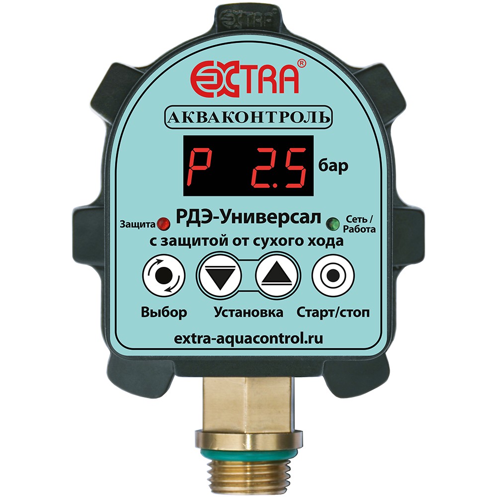 Электронное реле давления со специализированной конфигурацией функций для автоматизации включения/выключения скважинного/поверхностного насоса мощностью Р1, max - 2200 Вт. Прибор защищает от сухого хода и утечек, настраивается посредством меню на электронном цифровом дисплее.
