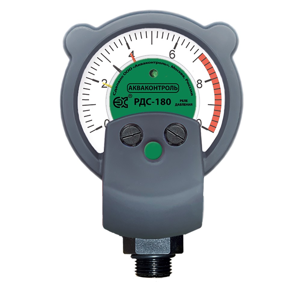 Реле Давления Стрелочное (РДС-180). Электронное устройство, для автоматизации включения/выключения поверхностного насоса мощностью Р1, max - 1500 Вт, с защитой от "сухого хода". Удобное недорогое устройство заменяет электромеханическое реле давления с манометром. Предельные параметры пуска-остановки насоса быстро, но точно настраиваются при помощи регулировочных винтов и двух стрелочных указателей разных цветов.