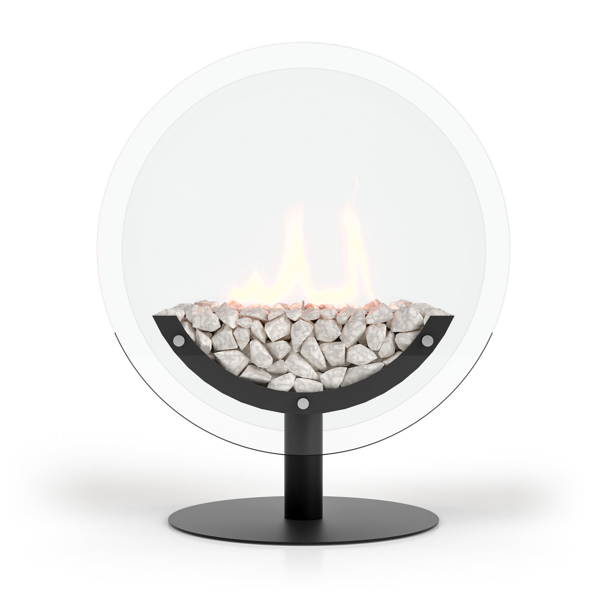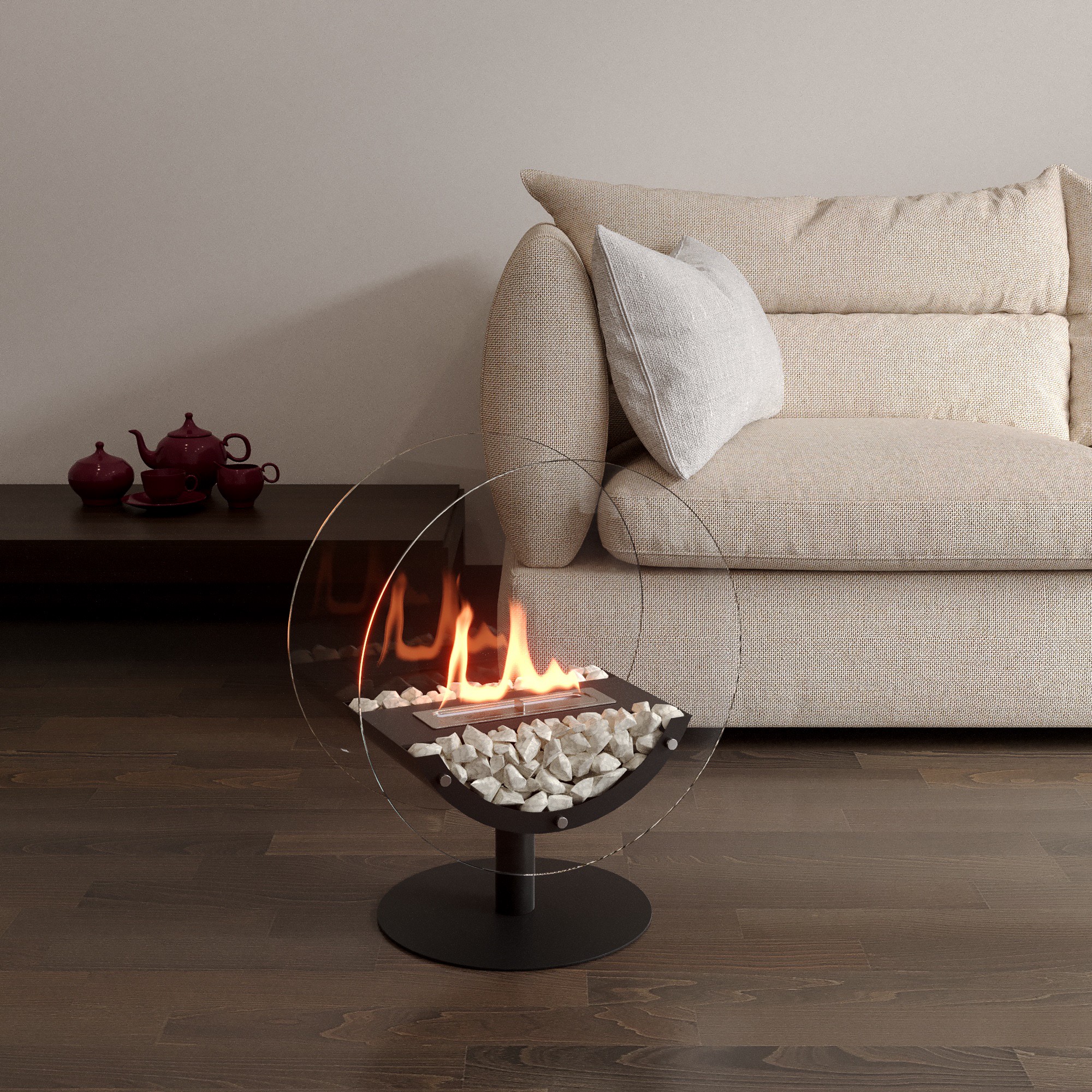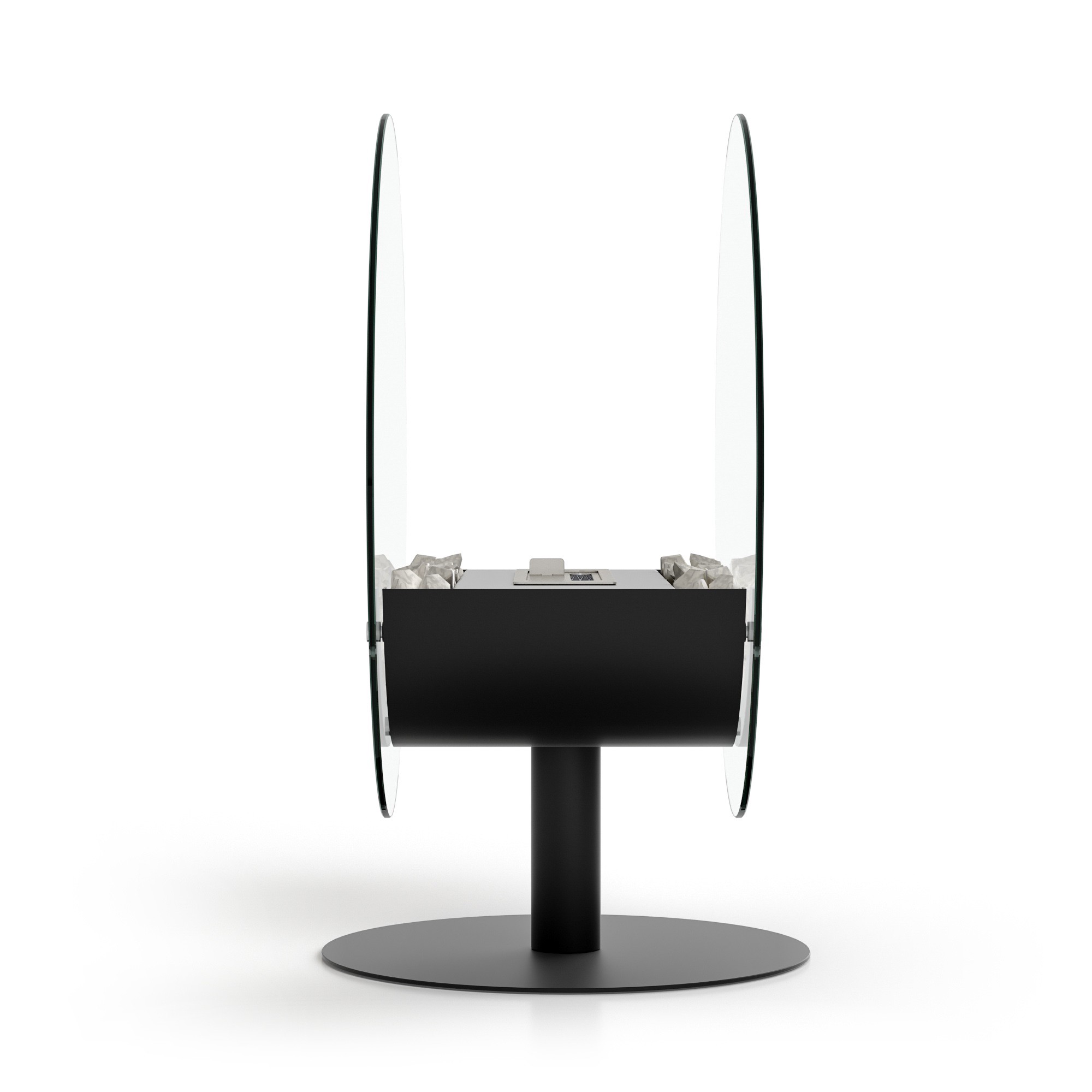 Биокамин представляет собой сборную напольную модель оригинального дизайна из закаленного прозрачного стекла и топливного блока на ножке.