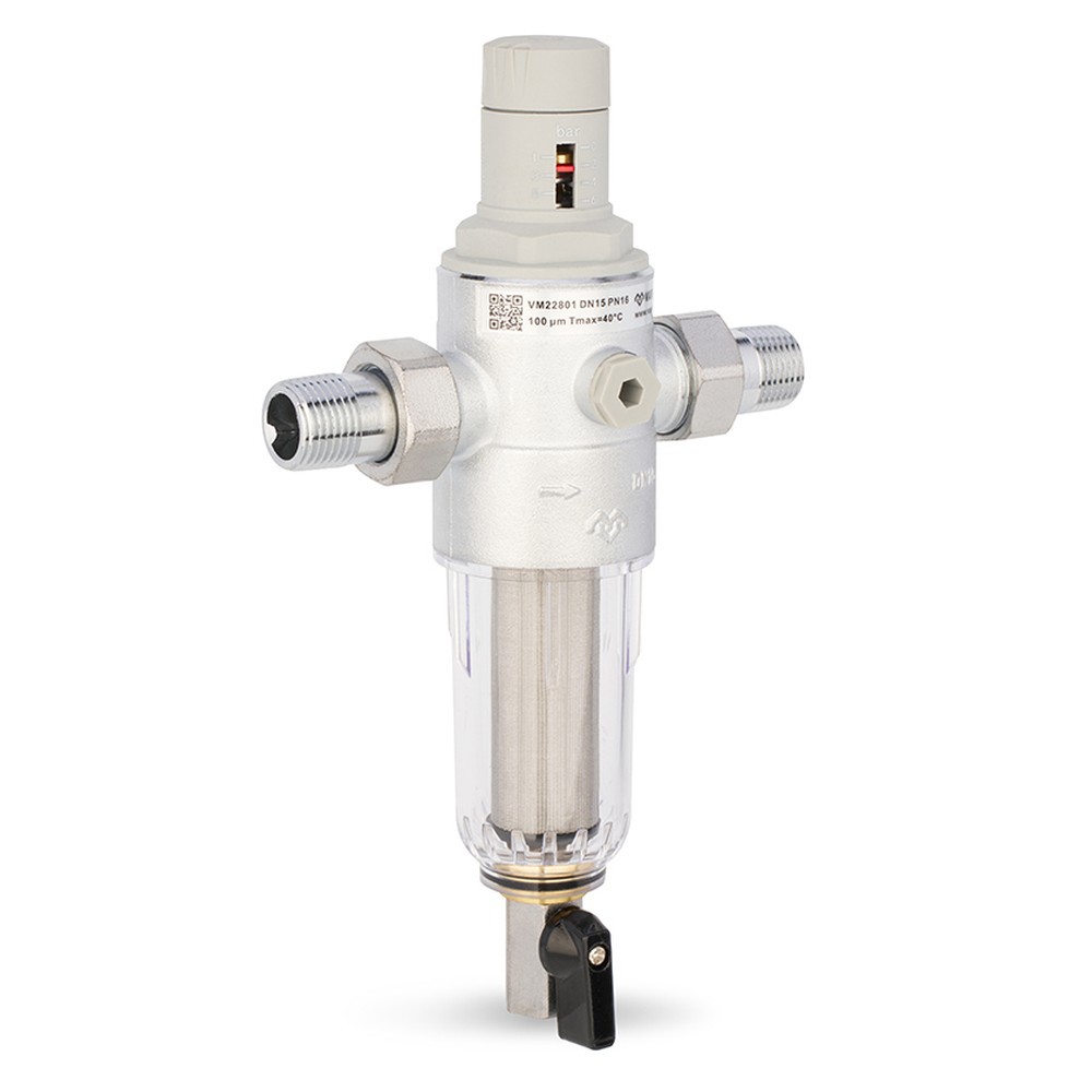 Комбинированные промывные фильтры Varmega сочетают в себе сразу два устройства -сетчатый фильтр прямой промывки и редуктор давления. Фильтр предназначен для предварительной фильтрации воды от различных механических примесей, он отлично задерживает ржавчину, песок, окалины и другой мусор, которого очень много в воде из центрального водопровода. Клапан понижения давления позволяет защитить трубопровод и устройства водопотребления от нежелательных колебаний давления, а также уменьшить расход воды. Максимальное входное давление составляет 16 бар, а давление на выходе может регулироваться в диапазоне от 1.5 до 6 бар, при этом заводская настройка выходного давления настроена на 3 бар. Манометр не входит в комплект поставки, но на корпусе с двух сторон есть места для подключения манометра. Благодаря своим компактным размерам, фильтр можно легко устанавливать в местах с ограниченным пространством, при этом монтаж допускается только на горизонтальном трубопроводе колбой вниз. Направление потока определяется стрелкой на корпусе.