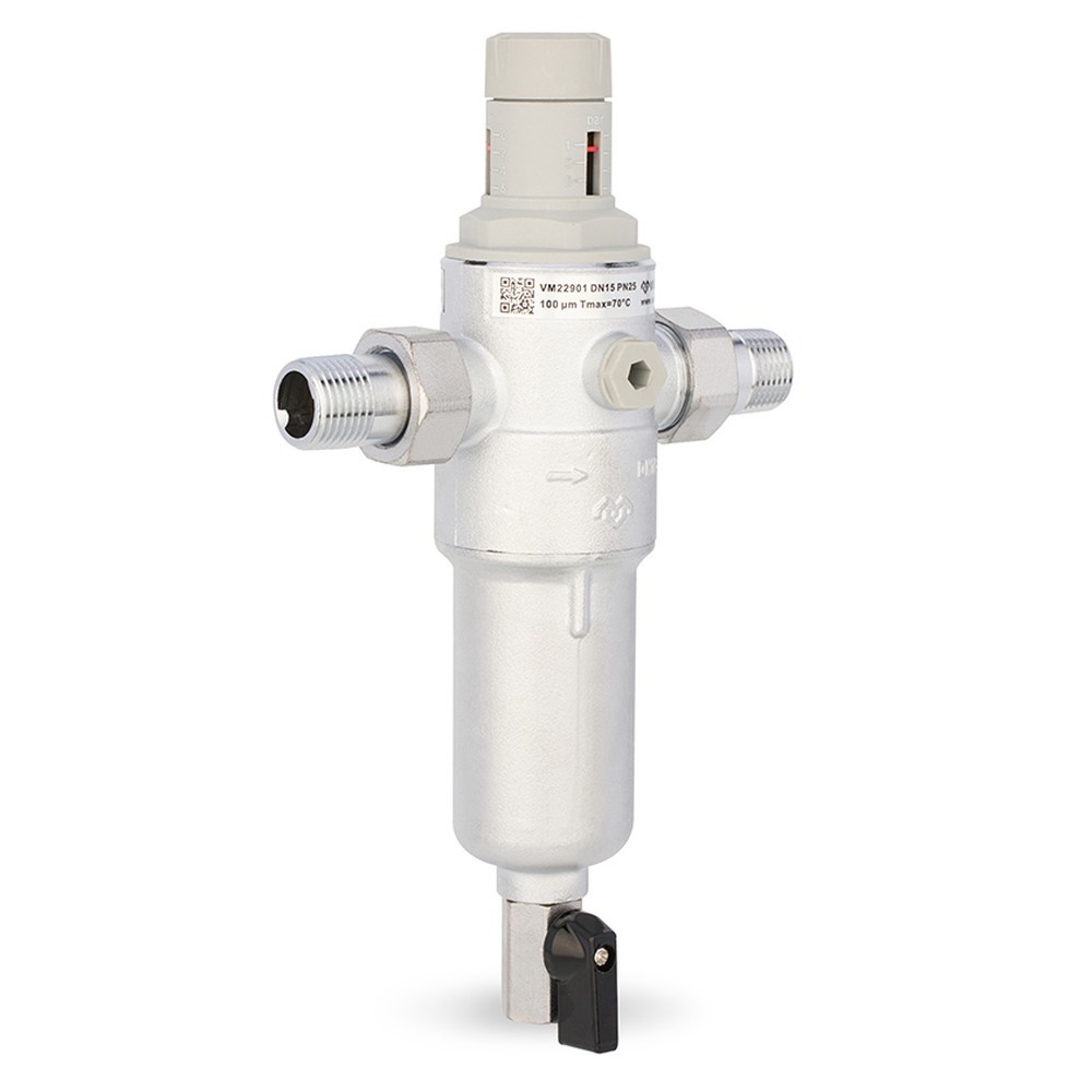Комбинированные промывные фильтры Varmega сочетают в себе сразу два устройства -сетчатый фильтр прямой промывки и редуктор давления. Фильтр предназначен для предварительной фильтрации воды от различных механических примесей, он отлично задерживает ржавчину, песок, окалины и другой мусор, которого очень много в воде из центрального водопровода. Клапан понижения давления позволяет защитить трубопровод и устройства водопотребления от нежелательных колебаний давления, а также уменьшить расход воды. Максимальное входное давление составляет 16 бар, а давление на выходе может регулироваться в диапазоне от 1.5 до 6 бар, при этом заводская настройка выходного давления настроена на 3 бар. Манометр не входит в комплект поставки, но на корпусе с двух сторон есть места для подключения манометра. Благодаря своим компактным размерам, фильтр можно легко устанавливать в местах с ограниченным пространством, при этом монтаж допускается только на горизонтальном трубопроводе колбой вниз. Направление потока определяется стрелкой на корпусе.