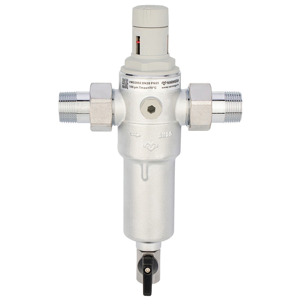 Комбинированные промывные фильтры Varmega сочетают в себе сразу два устройства -сетчатый фильтр прямой промывки и редуктор давления. Фильтр предназначен для предварительной фильтрации воды от различных механических примесей, он отлично задерживает ржавчину, песок, окалины и другой мусор, которого очень много в воде из центрального водопровода. Клапан понижения давления позволяет защитить трубопровод и устройства водопотребления от нежелательных колебаний давления, а также уменьшить расход воды. Максимальное входное давление составляет 16 бар, а давление на выходе может регулироваться в диапазоне от 1.5 до 6 бар, при этом заводская настройка выходного давления настроена на 3 бар. Манометр не входит в комплект поставки, но на корпусе с двух сторон есть места для подключения манометра. Благодаря своим компактным размерам, фильтр можно легко устанавливать в местах с ограниченным пространством, при этом монтаж допускается только на горизонтальном трубопроводе колбой вниз. Направление потока определяется стрелкой на корпусе.