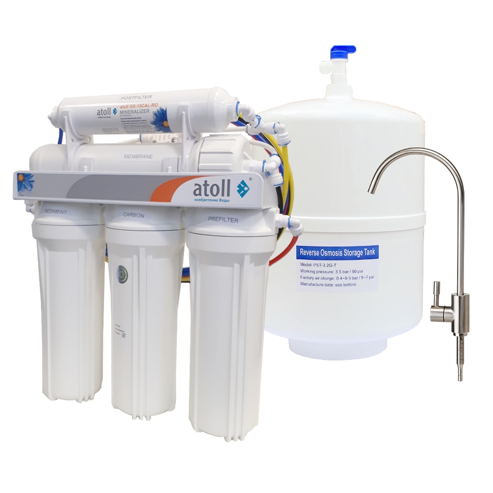 - Минерализатор atoll GS-10CAL/RO – последняя ступень очистки, непосредственно перед питьевым краном. Угольный постфильтр с кальцитом эффективно используется только в случаях, когда фильтр долгое время не использовался и очищенная вода, находящаяся в баке и трубках, могла приобрести неприятный привкус или запах. Кальцит обогащает воду полезными минеральными солями.