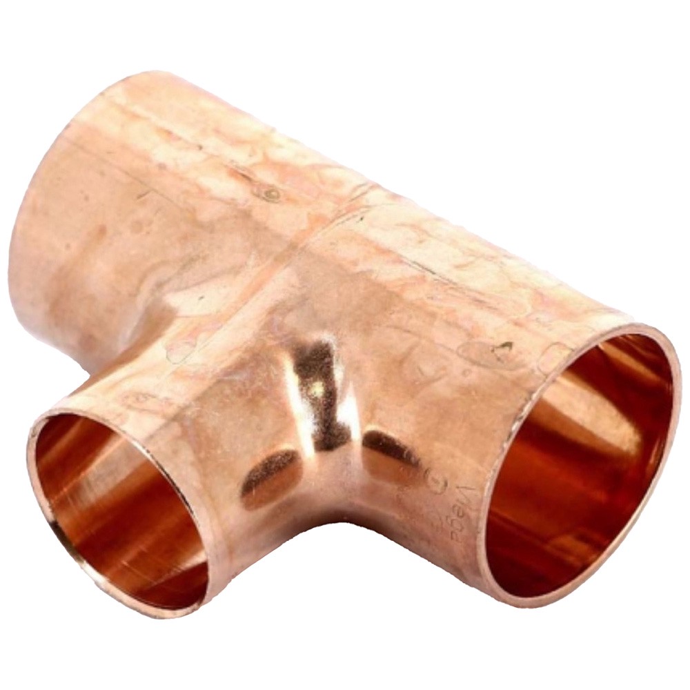 Медный переходной тройник предназначен для создания разветвлений в трубопроводных системах с изменением диаметра. Основные проходы фитинга имеют диаметр 28 мм, а боковой отвод - 15 мм, что позволяет осуществлять плавный переход между трубами разного сечения.