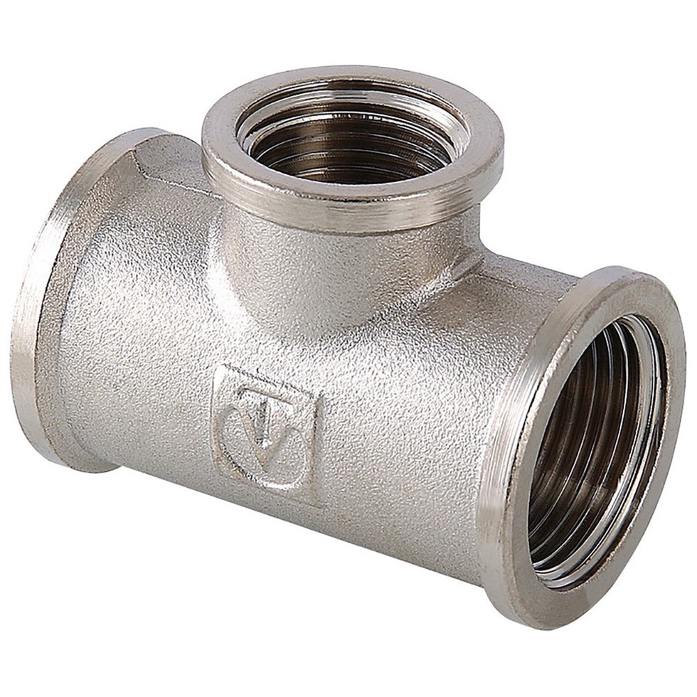 Латунный никелированный трехсторонний фитинг с переходом на меньший диаметр в центральном выходе. Резьба – внутренняя, цилиндрическая трубная по ГОСТу 6357 (ISO 228, EN 10226), совместима также с наружной конической трубной резьбой по ГОСТу 6211 (ISO R7).
