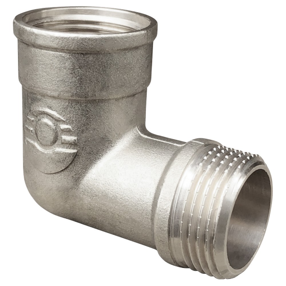 Угольник с переходом на наружную резьбу - угловой латунный никелированный фитинг, который позволяет соединить две трубы под прямым углом.