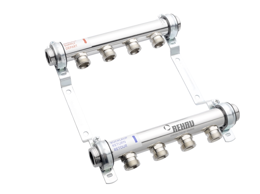 Подающий и обратный коллекторы, с возможностью двухстороннего присоединения с наружной резьбой G1" под плоское уплотнение; Никелированные заглушки G1" со встроенными воздушными клапанами и уплотнением; Ниппельные отводы под резьбозажимные соединения REHAU Евроконус G3/4"; Коллекторы установлены на звукоизолированные оцинкованные кронштейны