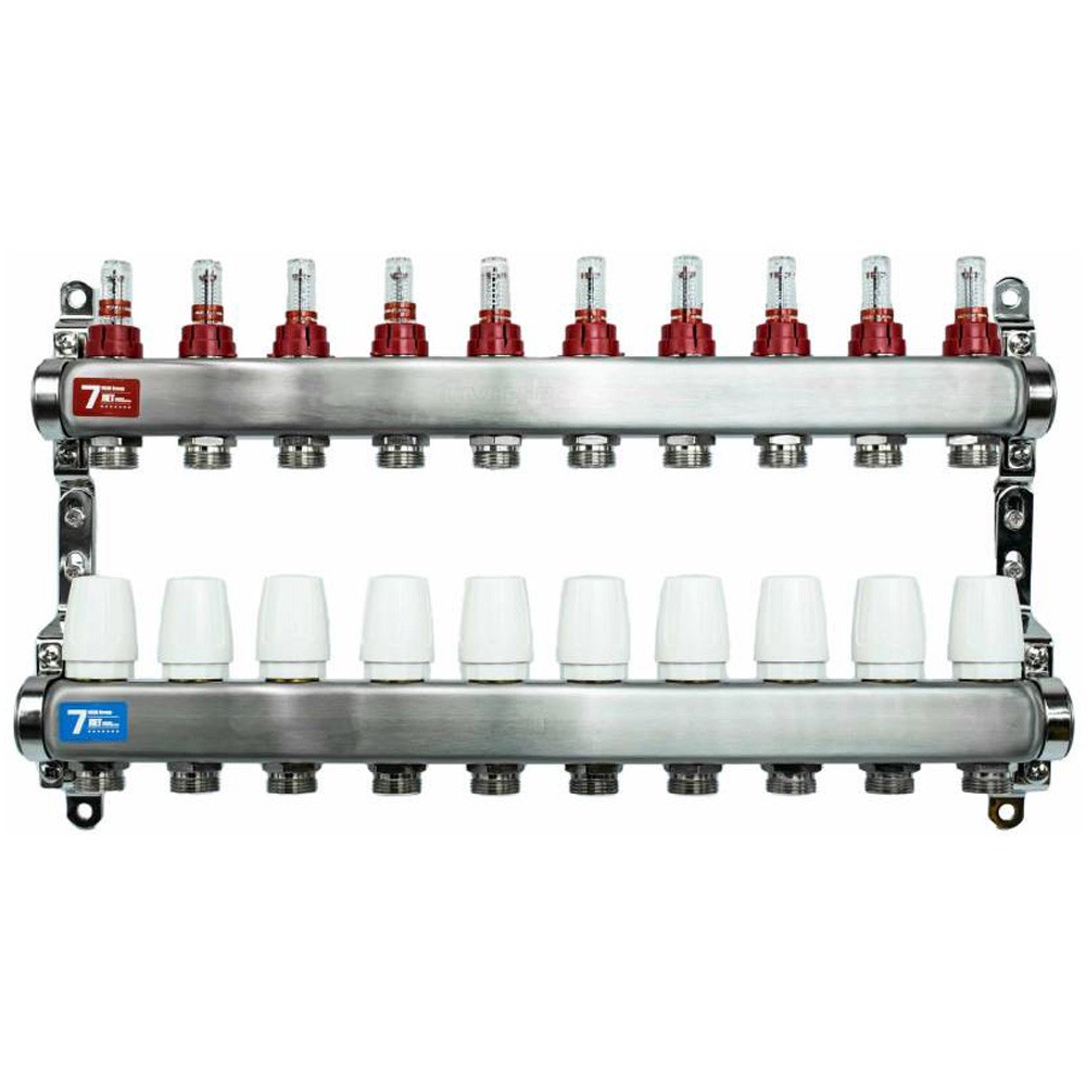 Коллекторные блоки выпускаются с количеством выходов от 2 до 12 и диаметром условного прохода коллекторов 1".