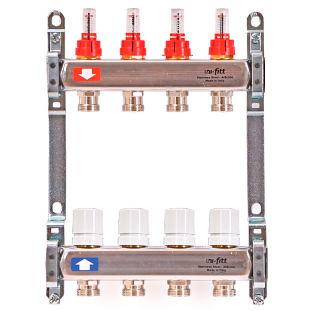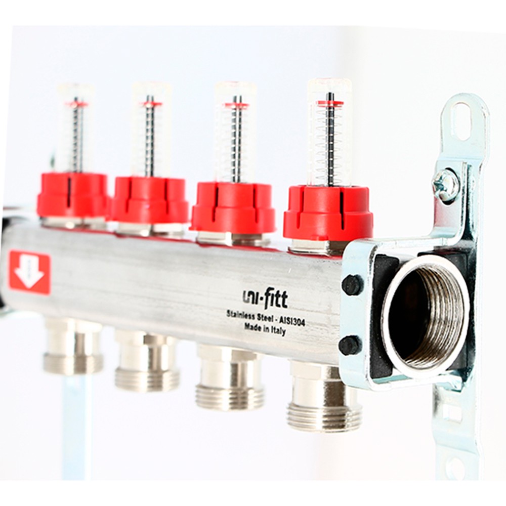 Коллекторные группы Uni-Fitt предназначены для распределения и регулирования потоков теплоносителя в низко- или высокотемпературных системах отопления. Оснащены расходомерами на подающем коллекторе и термостатическими вентилями (с возможностью установки термоэлектрических приводов) на обратном коллекторе.