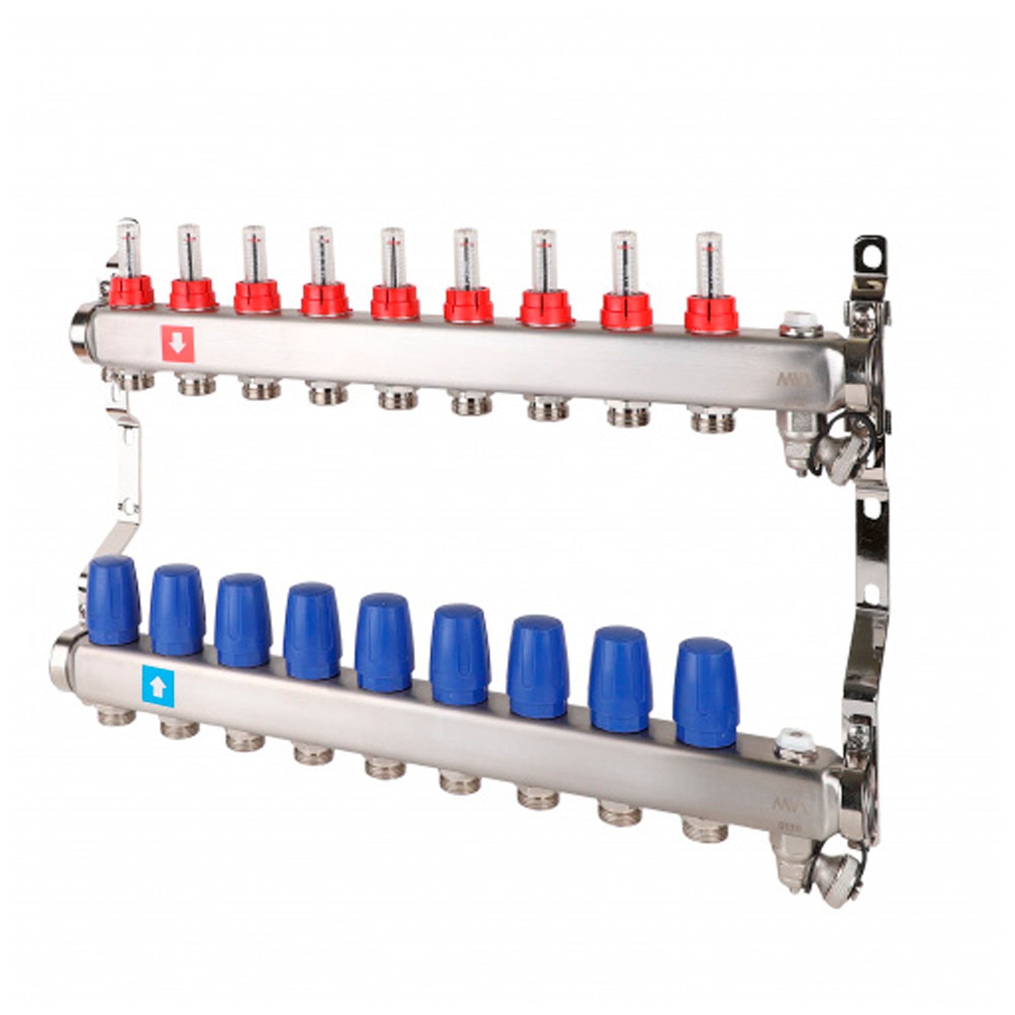 Коллектор MVI с расходомерами, дренажным краном и краном Маевского 1" х 3/4"ЕК 9 вых.