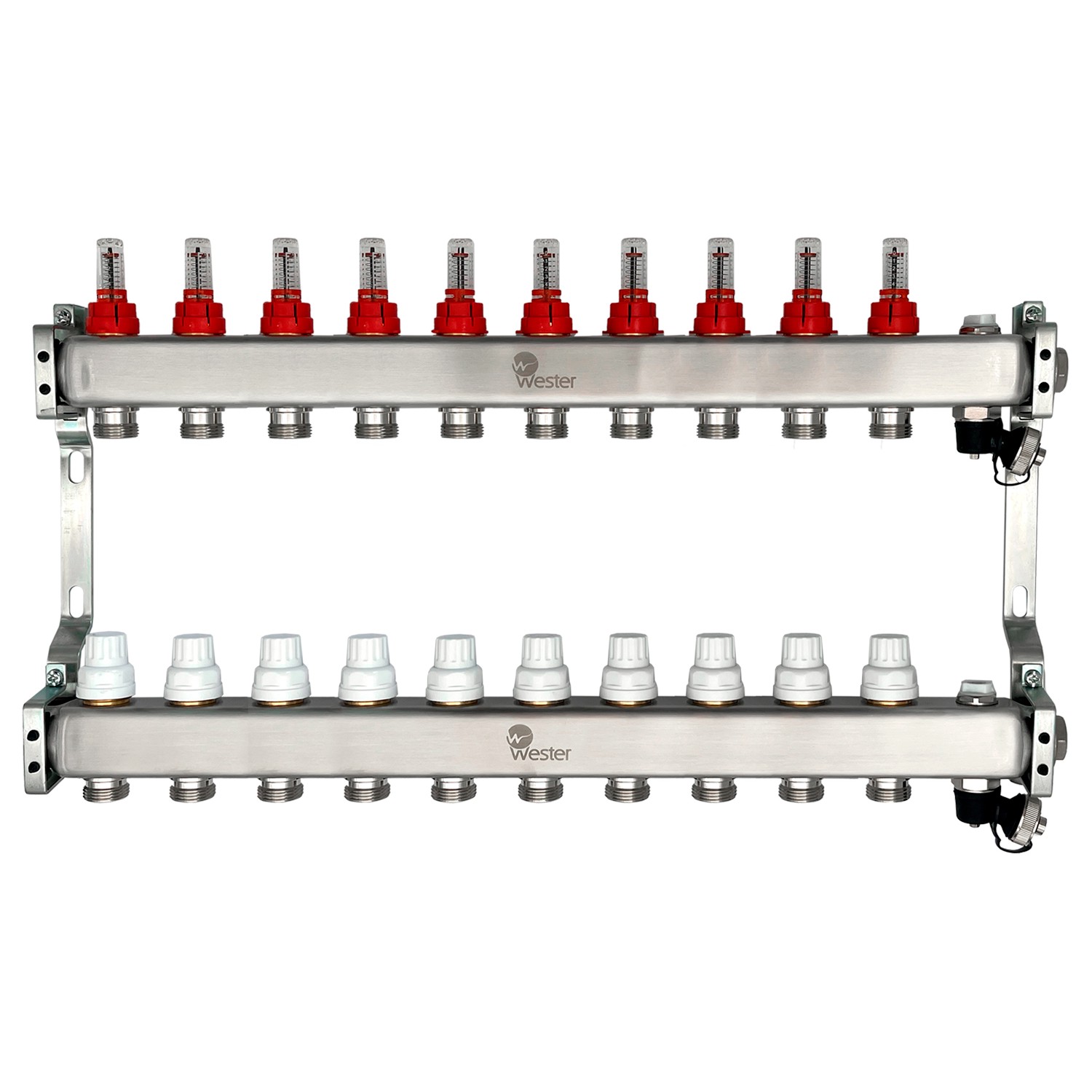 Коллекторный блок распределительный Wester с расходомерами и регулировочными клапанами серии 5 предназначен для оптимизации и контроля распределения теплоносителя в системах радиаторного отопления и подогрева полов.