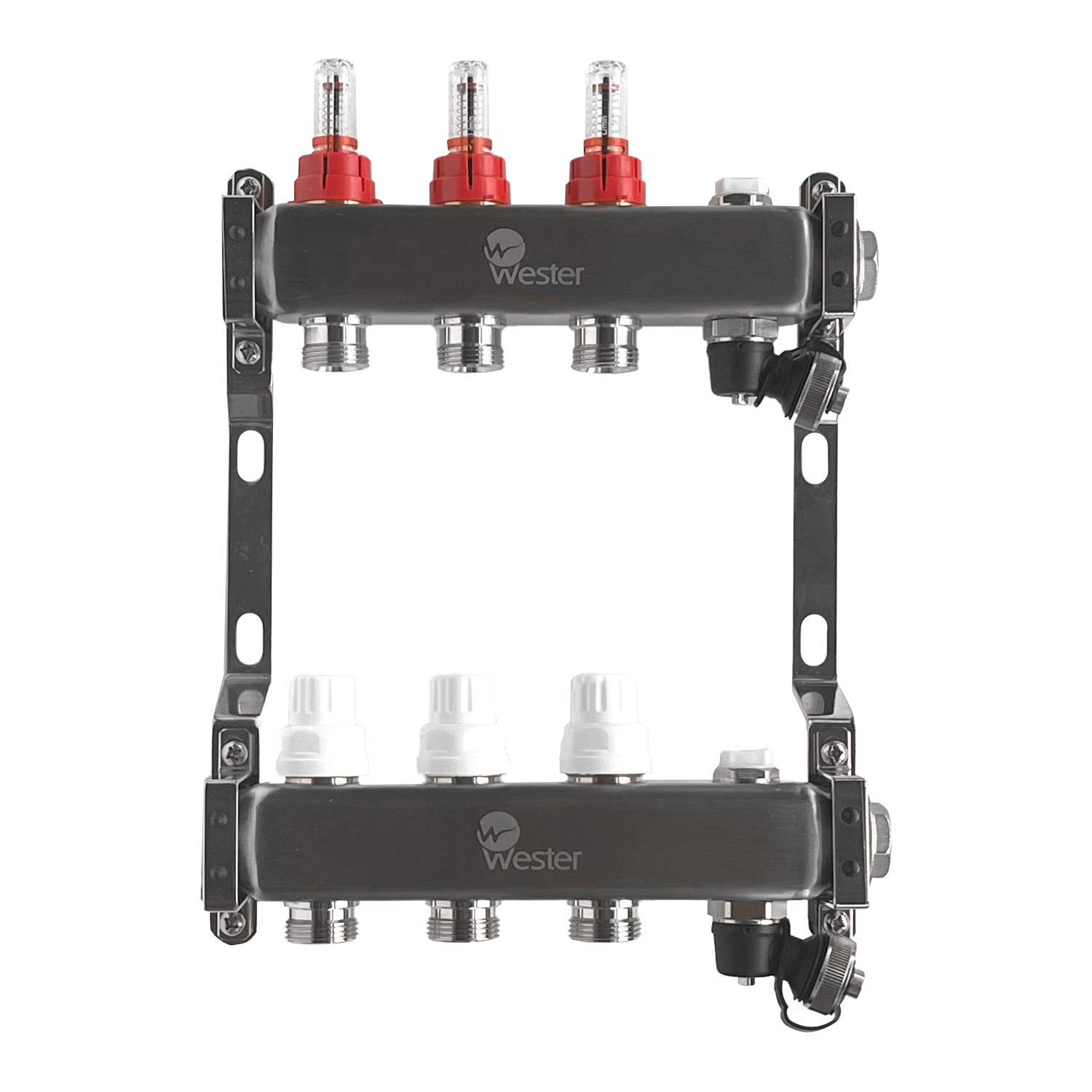 Коллекторный блок распределительный Wester с расходомерами и регулировочными клапанами серии 5 предназначен для оптимизации и контроля распределения теплоносителя в системах радиаторного отопления и подогрева полов.