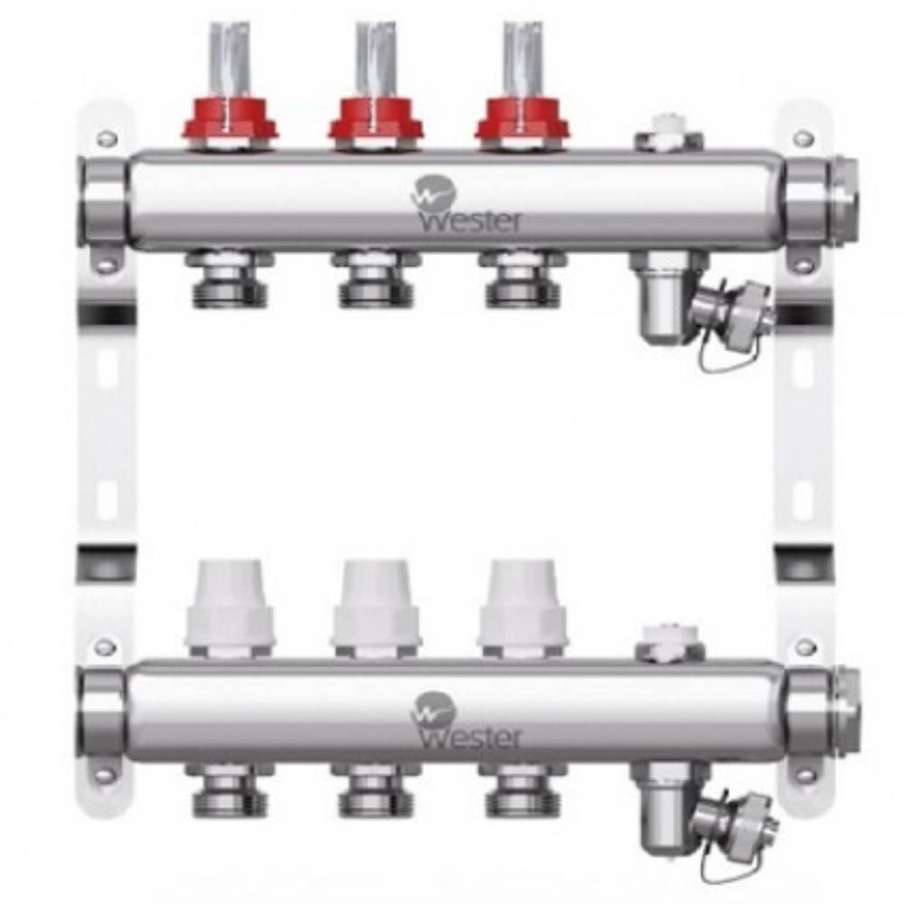 Коллекторы Wester W902 из нержавеющей стали с расходомерами и запорными клапанами предназначены для оптимизации и контроля распределения теплоносителя в системах радиаторного отопления и подогрева пола.
