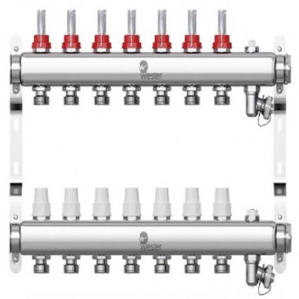 Коллекторы Wester W902 из нержавеющей стали с расходомерами и запорными клапанами предназначены для оптимизации и контроля распределения теплоносителя в системах радиаторного отопления и подогрева пола.