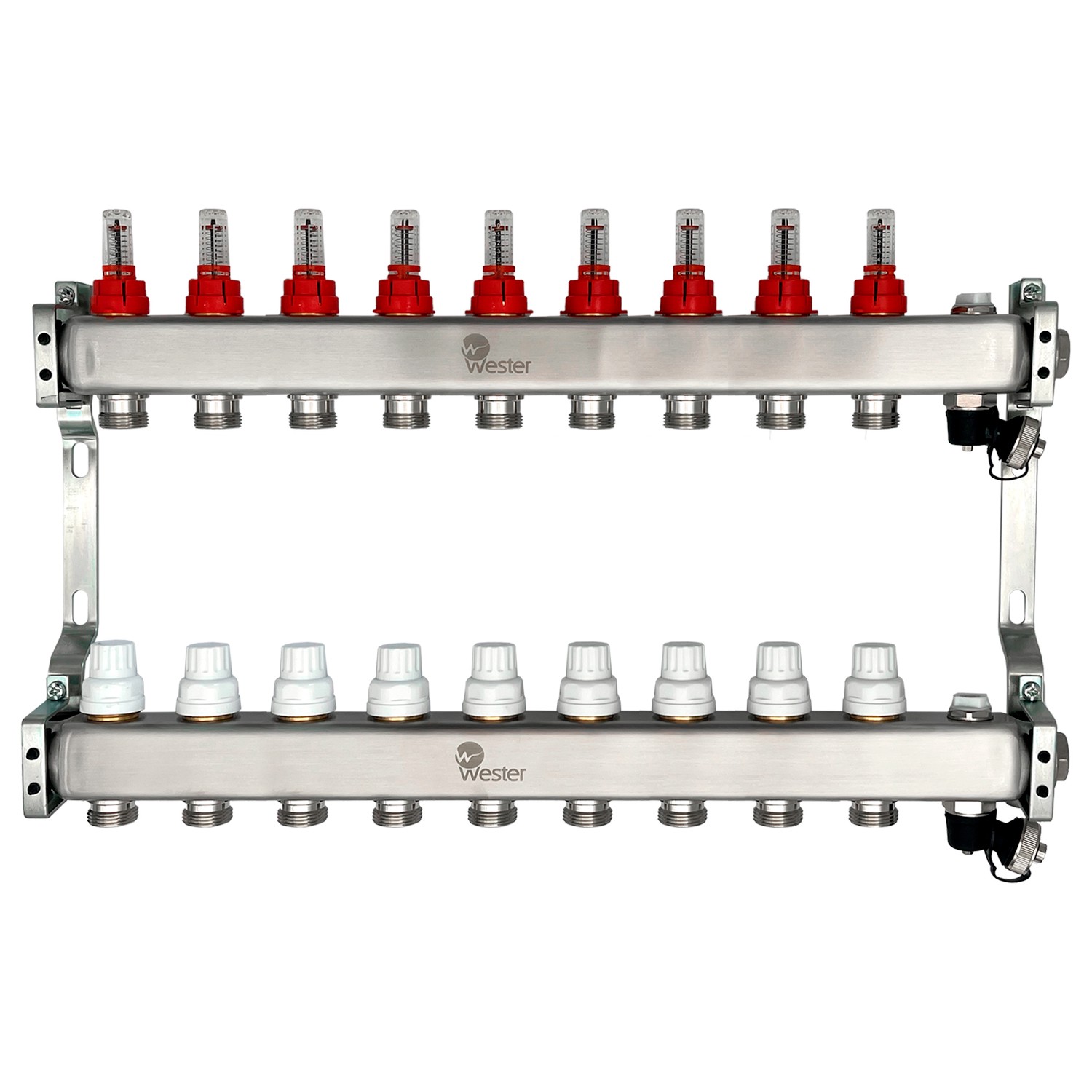 Коллекторный блок распределительный Wester с расходомерами и регулировочными клапанами серии 5 предназначен для оптимизации и контроля распределения теплоносителя в системах радиаторного отопления и подогрева полов.