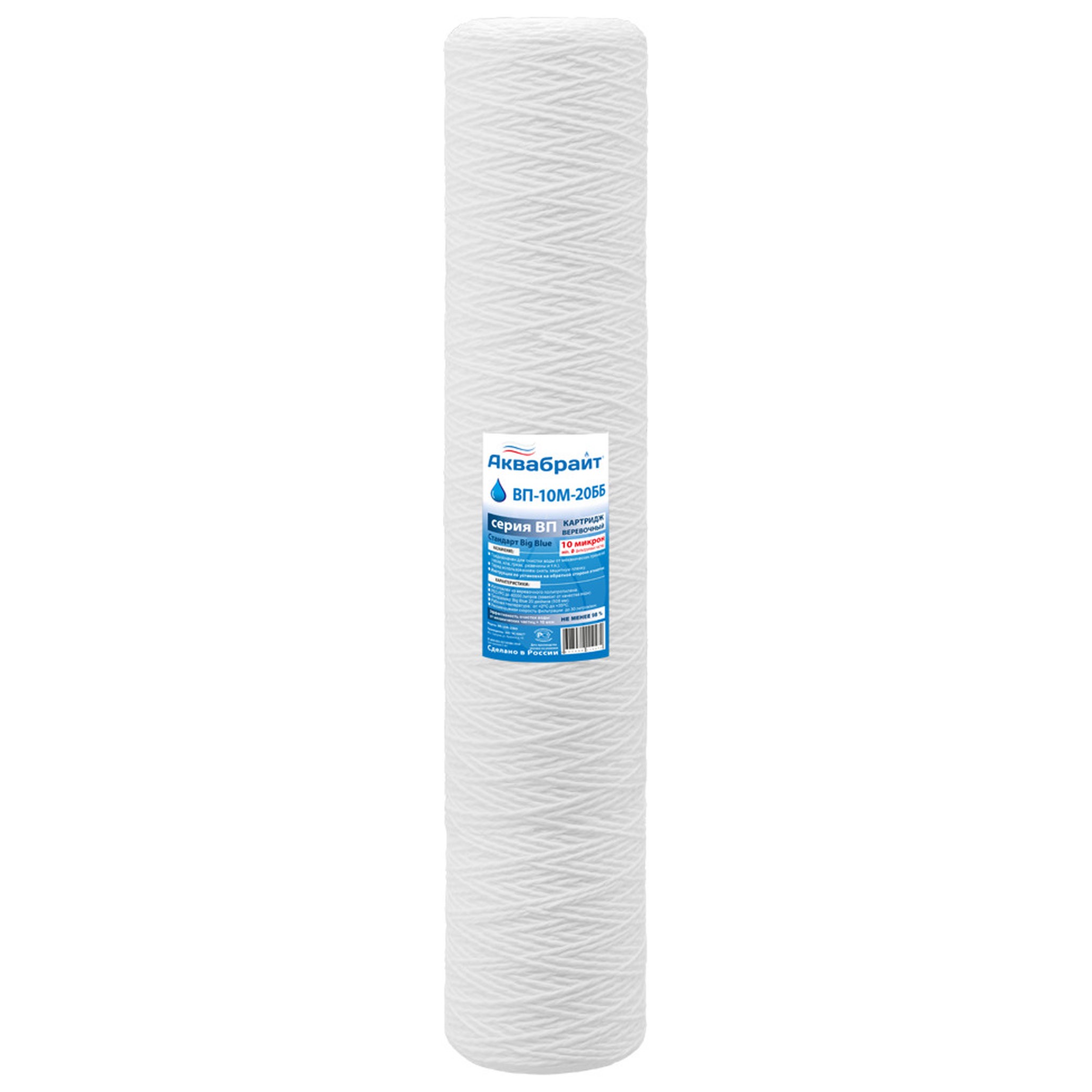 Картридж АКВАБРАЙТ ВП-10М-20ББ изготовлен из веревочного полипропилена с пищевым допуском. Используется в бытовых магистральных системах очистки воды стандарта ВВ20.