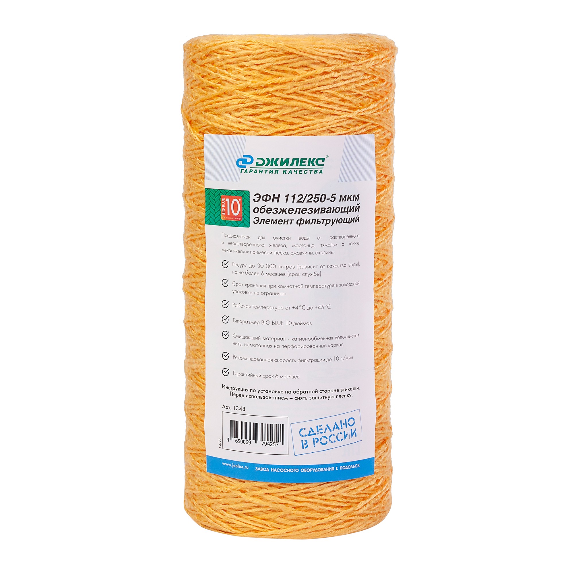 Элемент фильтрующий предназначен для очистки воды от растворенного и нерастворенного железа, марганца, тяжелых а также механических примесей: песка, ржавчины, окалины. Очищающий материал - катионообменная волокнистая нить, намотанная на перфорированный каркас.