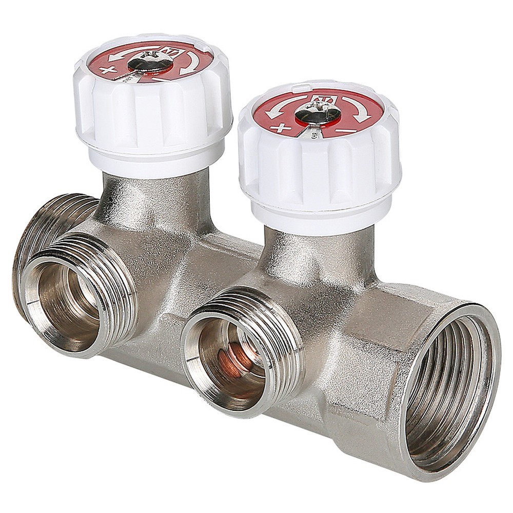 (VTc.570.NE) Латунный никелированный коллектор c выходами 3/4", «евроконус» (резьба – наружная). На каждом выходе предусмотрен вентиль для регулирования расхода рабочей среды. Диаметр коллектора – 1", резьба – внутренняя/наружная.
