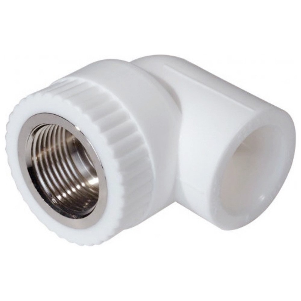 Двухсторонний комбинированный фитинг для соединения под углом 90 друг к другу полипропиленового трубопровода и компонента инженерной системы с резьбовым подключением. Резьба фитинга внутренняя трубная.