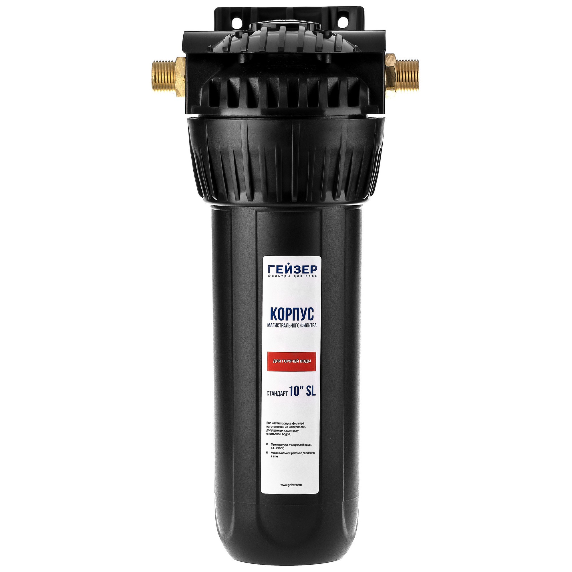 Корпус Гейзер 10SL 1/2" изготовлен из термостойкого полиамида с металлическими ниппелями. Корпус рассчитан на работу под давлением и установку на входе в систему горячего или холодного водоснабжения. Комплектуется пластиковой скобой. В производстве корпусов используются материалы пищевого класса.