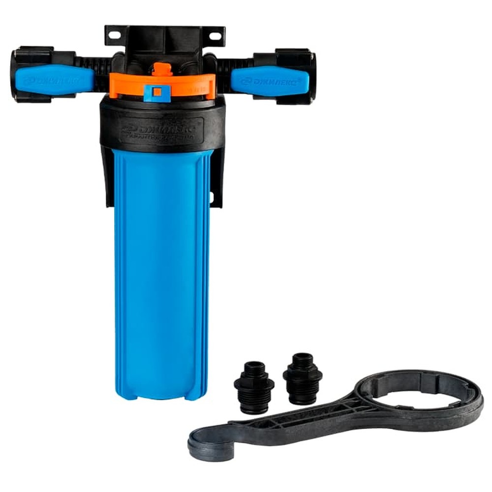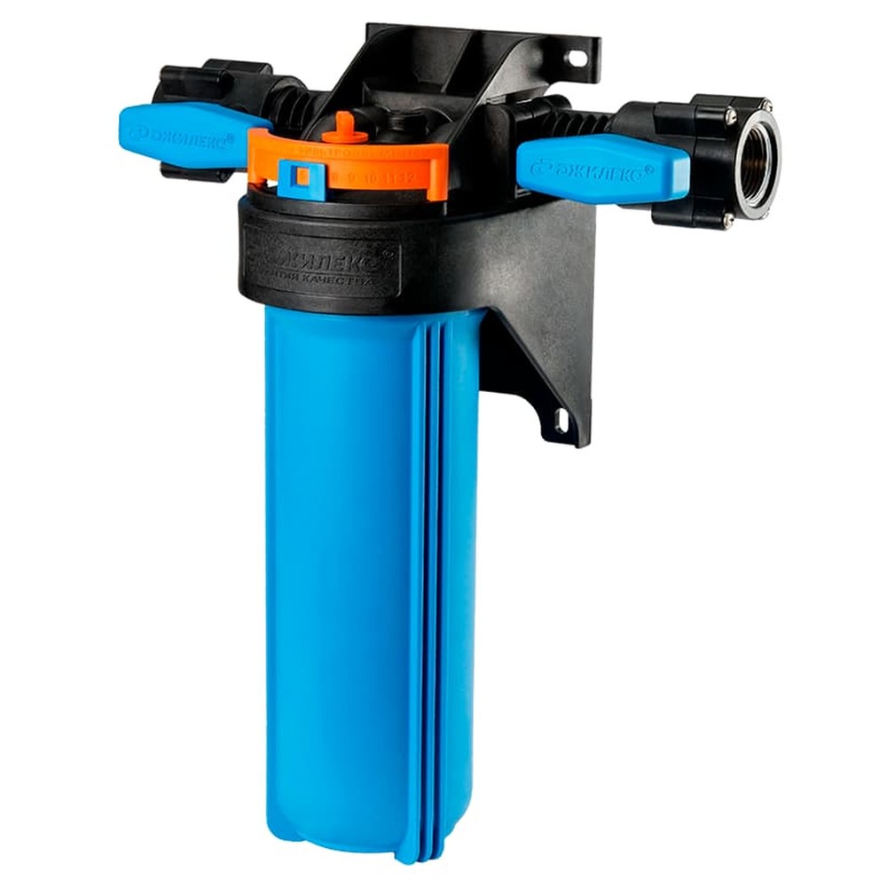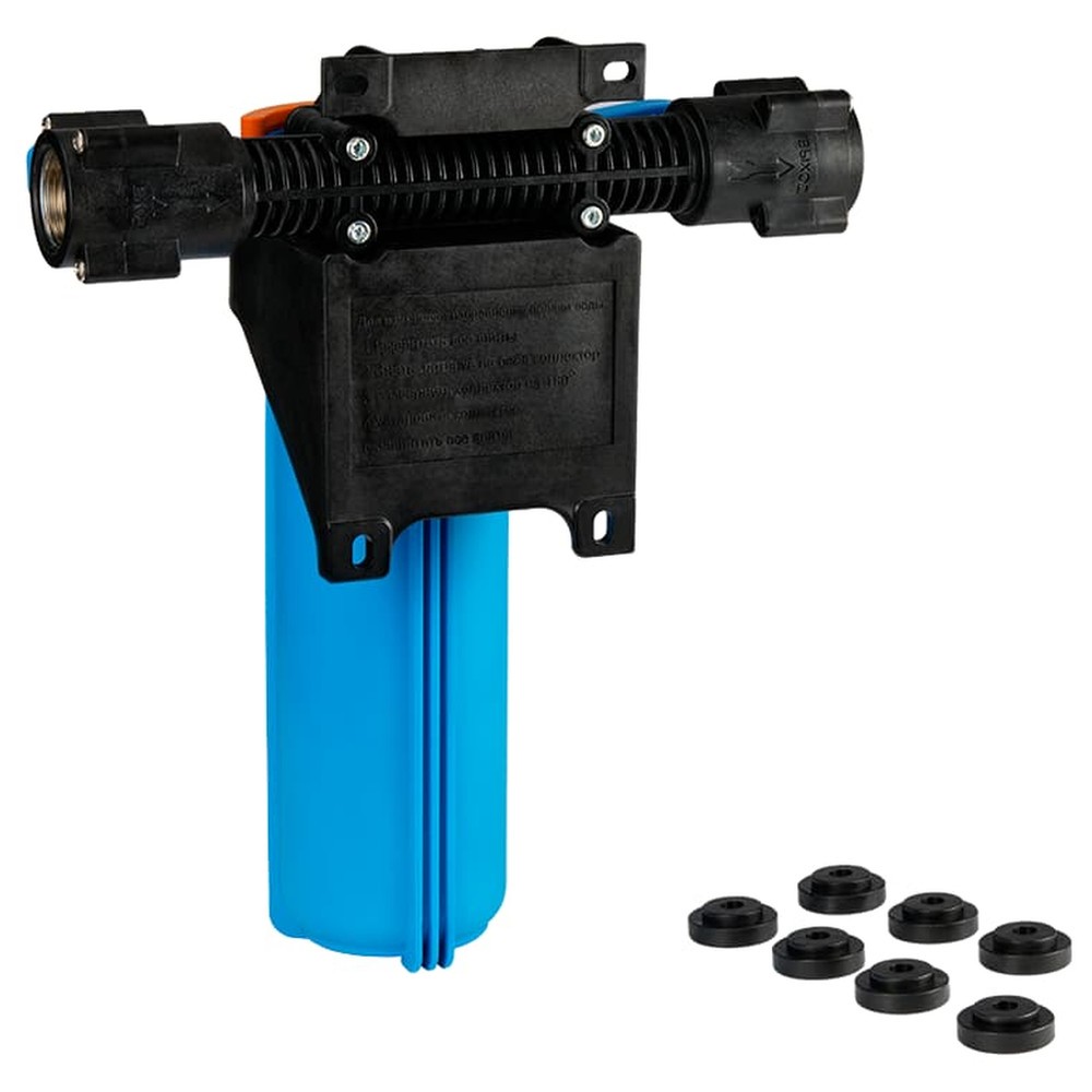 Корпус для картриджного фильтра предназначен для размещения в нём картриджей или фильтрующей засыпки для дальнейшей очистки холодной воды в бытовых условиях. Типоразмер колбы - SlimLine 10”. Поворот коллектора на 180° позволяет установить корпус фильтра в магистраль, с направлением движения воды, как слева направо, так и справа налево. Магистральную трубу можно разместить вплотную к стене. Кронштейн является одним целым с крышкой корпуса фильтра. В корпусе предусмотрены специальные технологические отверстия (пробки) для сброса избыточного давления и слива остаточной воды. В комплект поставки входит ключ, с помощью которого можно отвернуть колбу от крышки, а также уплотнительная вставка белого цвета для картриджных элементов без сердечника. На концах коллектора встроены шаровые краны.