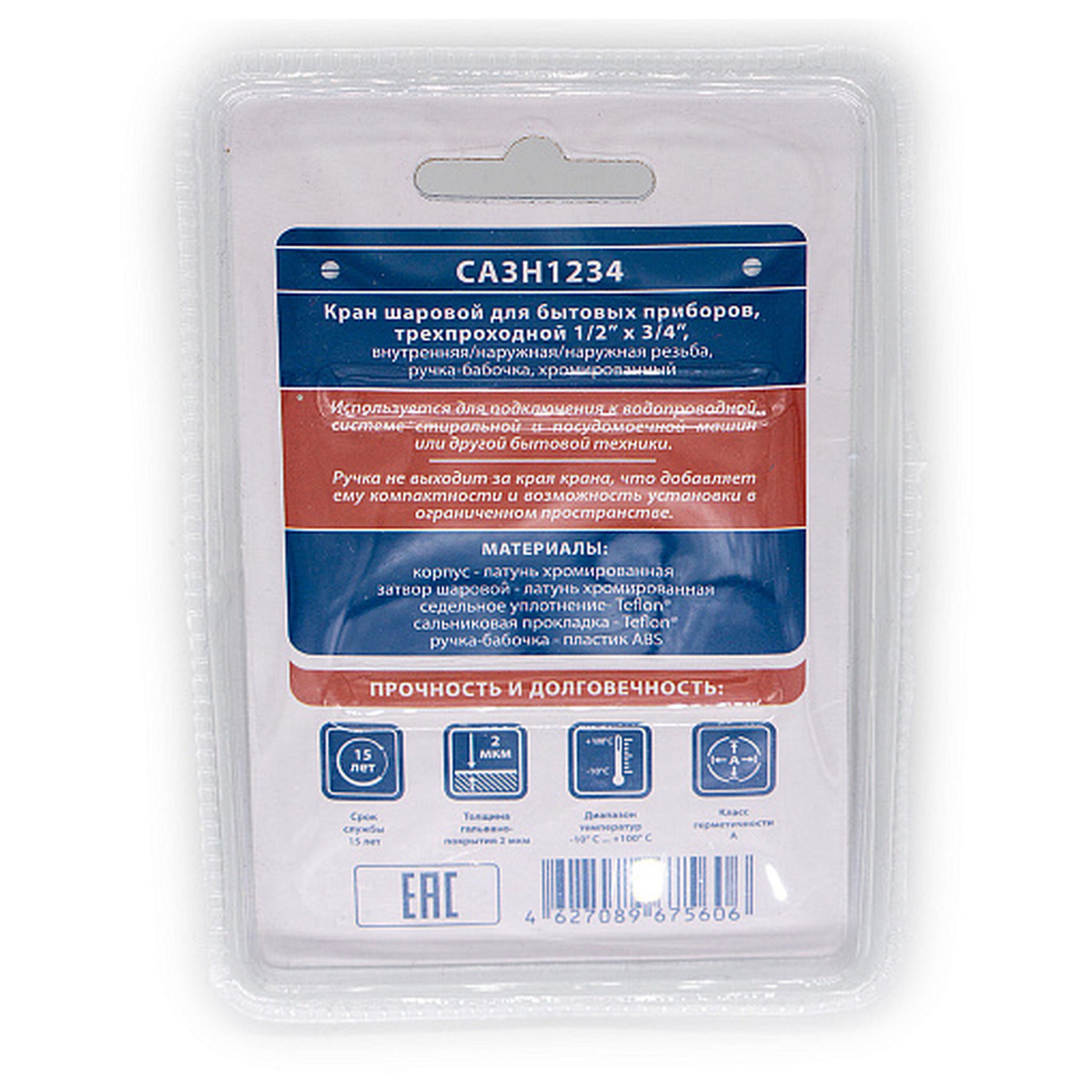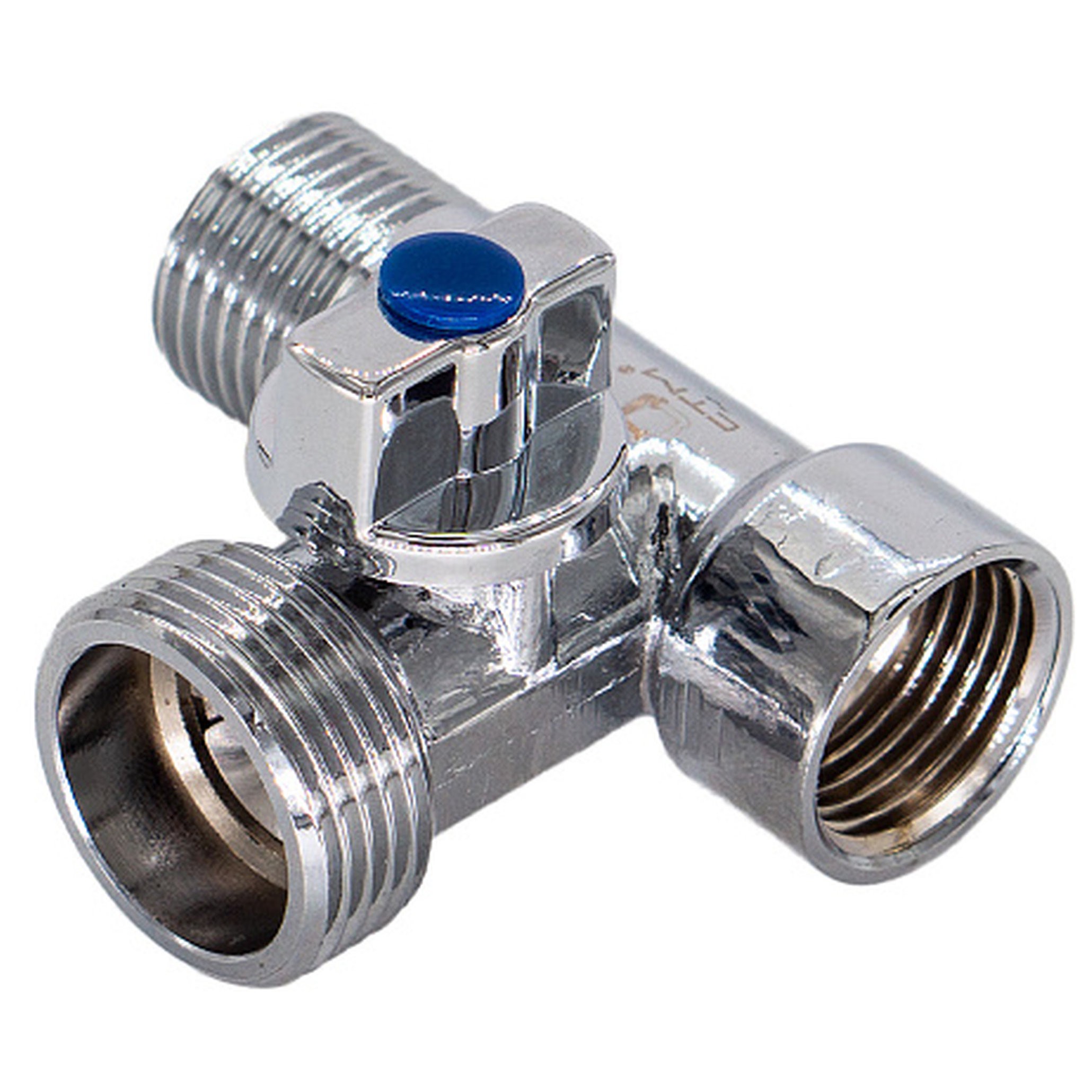 Кран шаровой для бытовых приборов 1/2"х3/4"х1/2" г/ш/ш CTM хромированный применяется для подключения бытовых (стиральные, посудомоечные машины и др.) и сантехнических приборов к системе холодного водоснабжения. Корпус крана изготовлен из высококачественной горячепрессованной латуни с хромированным покрытием (толщина гальванопокрытия 0 2 мкм). Шаровой затвор изготовлен из высококачественной горячепрессованной латуни, отполирован и покрыт хромом. Герметичность затвора крана соответствует наиболее высоком классу по ГОСТу 9544-2005 – А. Кран оснащен пластиковой рукояткой флажкового типа. Рукоятка выполнена таким образом, что при повороте не выходит за края корпуса крана, что добавляет ему компактности и возможность установки в ограниченном пространстве Техническое обслуживание крана в течение всего срока эксплуатации не требуется (средний срок службы – 15 лет, средний ресурс наработки на отказ – 10000 циклов).