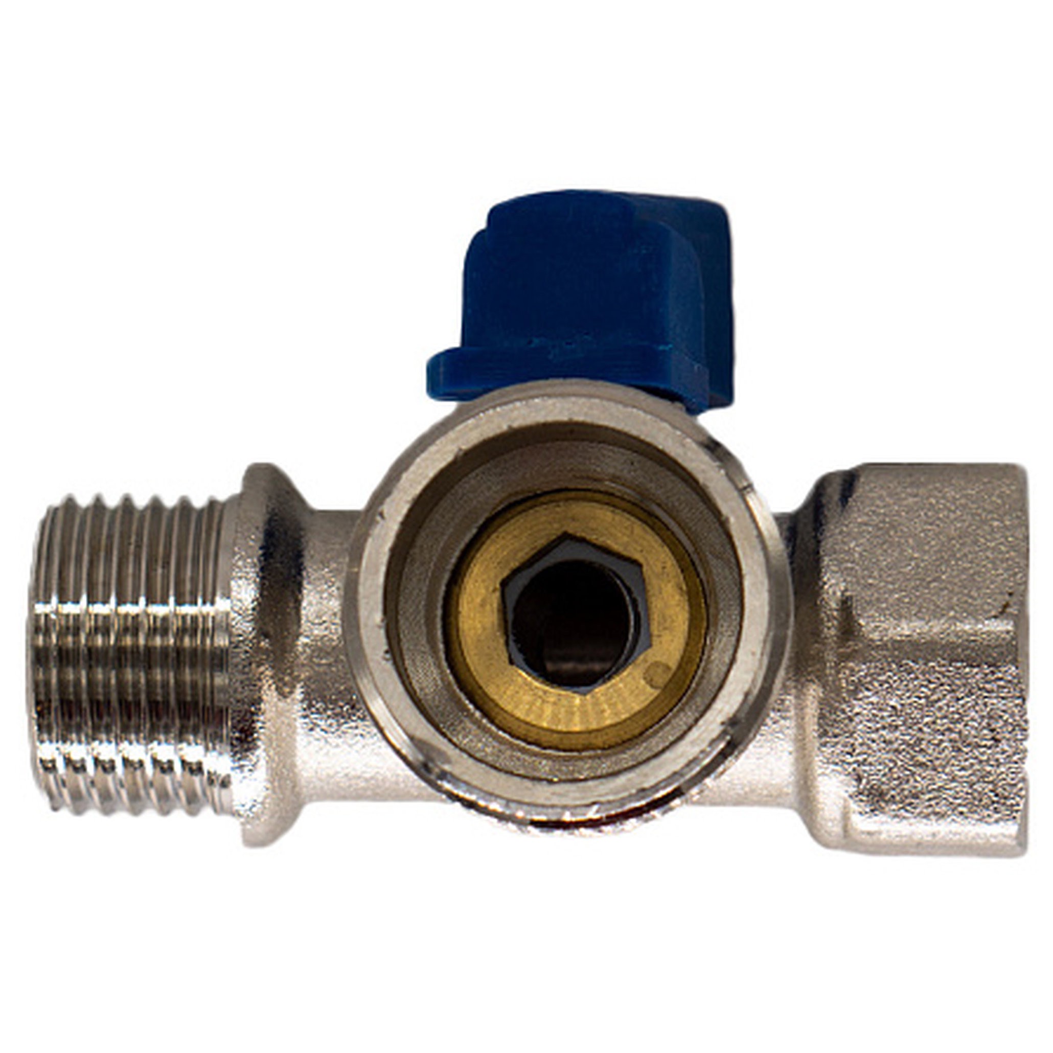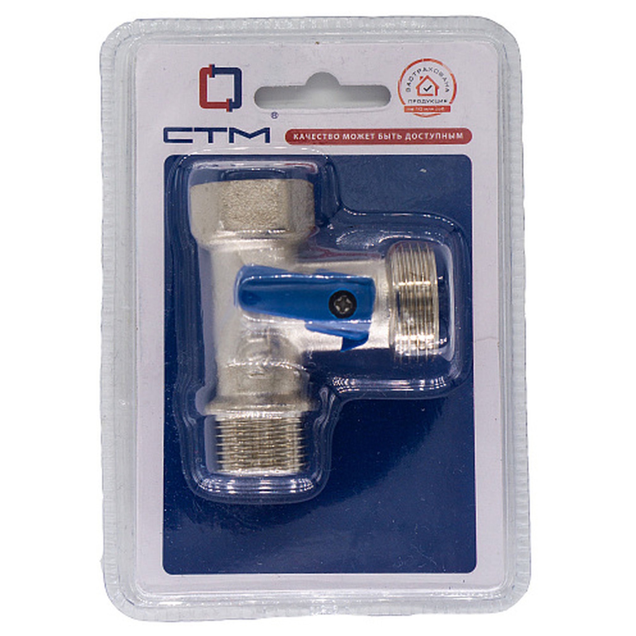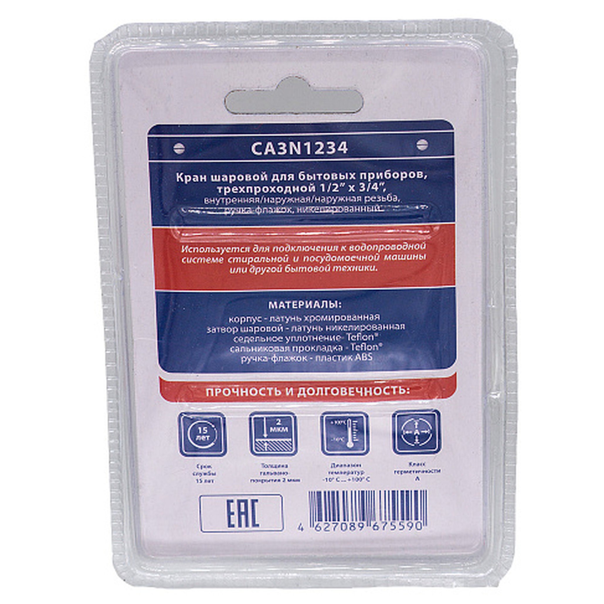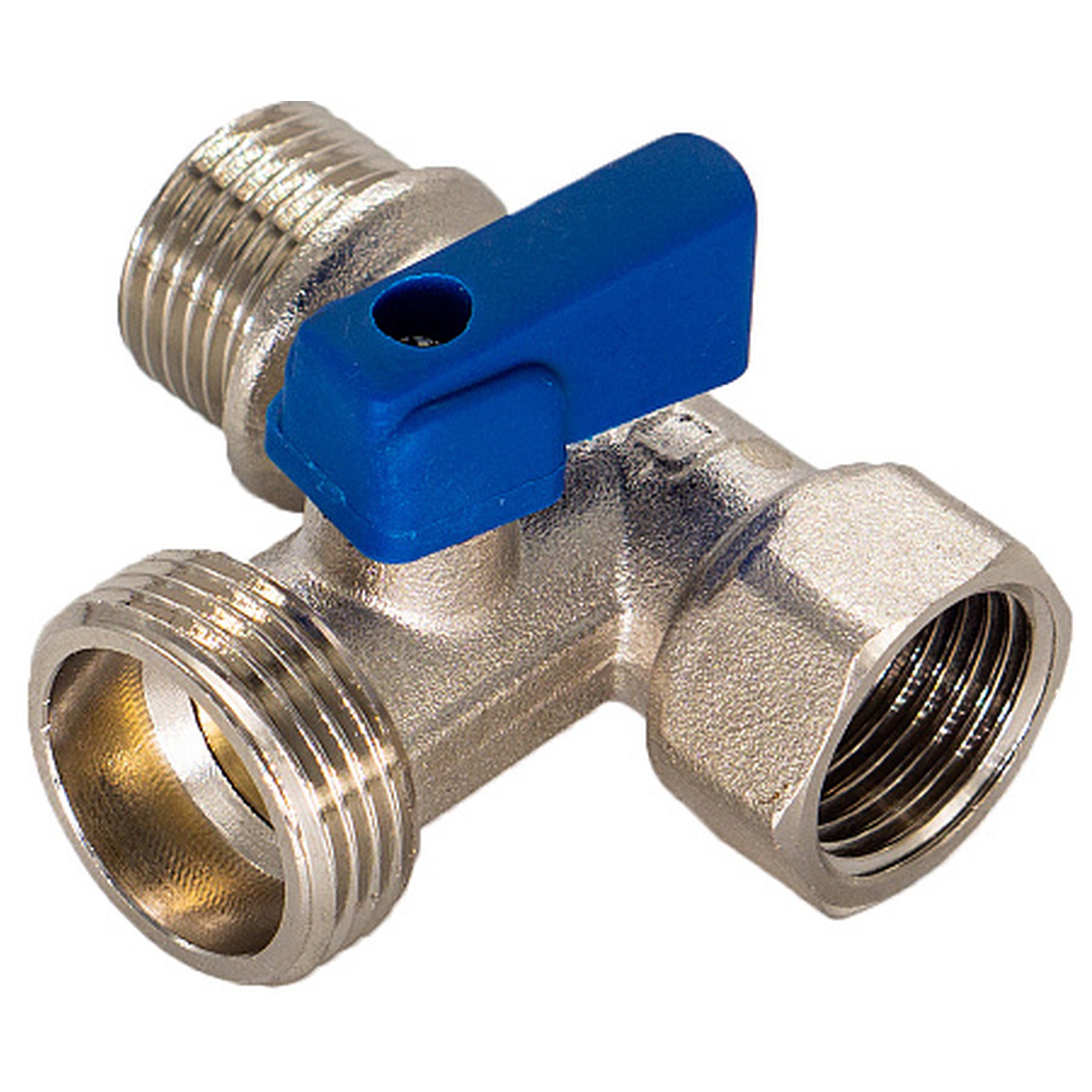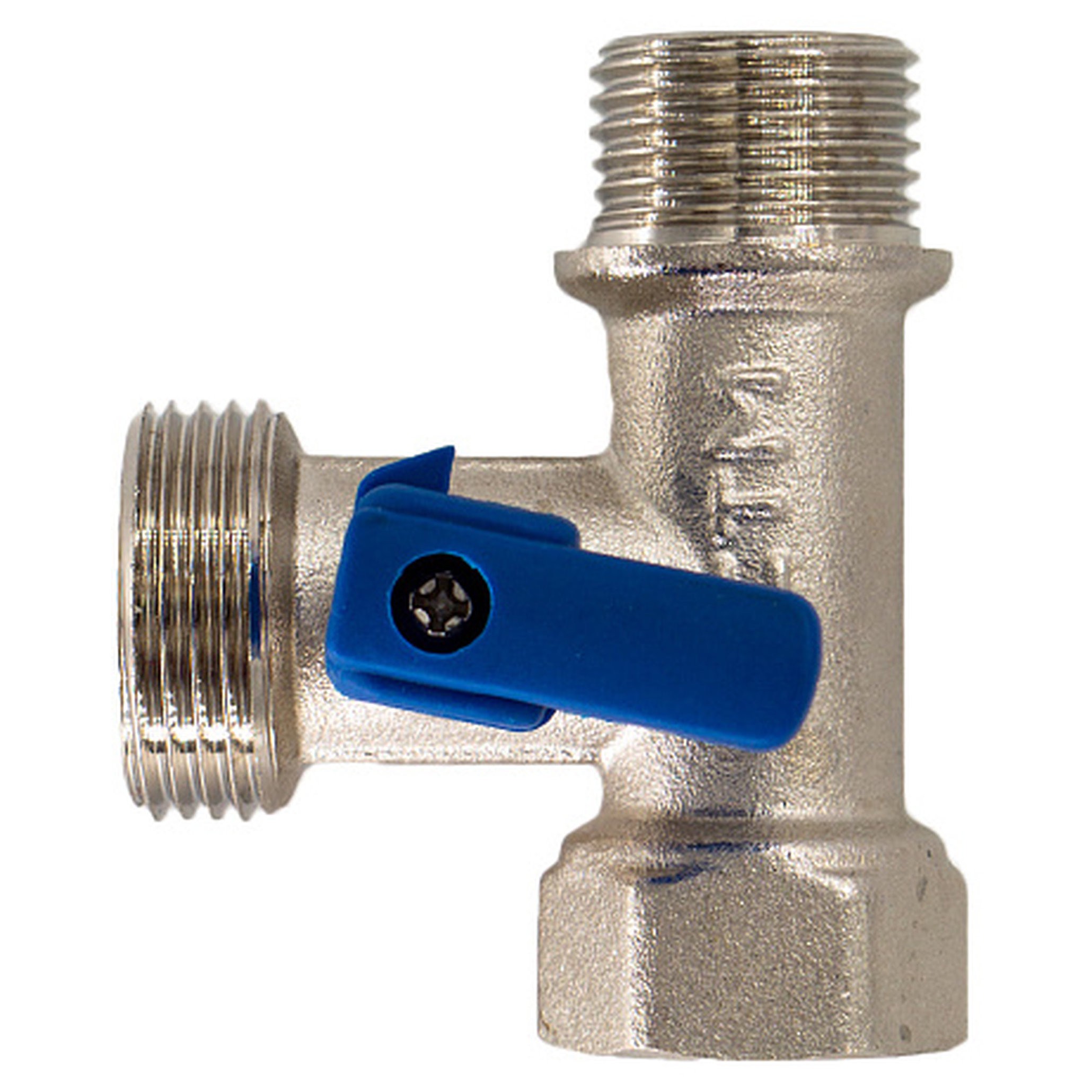 Кран шаровой для бытовых приборов 1/2"х3/4"х1/2" г/ш/ш CTM никелированный применяется для подключения бытовых (стиральные, посудомоечные машины и др.) и сантехнических приборов к трубопроводам хозяйственно-бытового назначения и системе холодного водоснабжения. Корпус крана изготовлен из высококачественной горячепрессованной латуни с никелированным покрытием. Шаровой затвор изготовлен из высококачественной горячепрессованной латуни, отполирован и покрыт хромом. Герметичность затвора крана соответствует наиболее высоком классу по ГОСТу 9544-2005 – А. Кран оснащен синей пластиковой ручкой флажкового типа. Техническое обслуживание крана в течение всего срока эксплуатации не требуется (средний срок службы – 15 лет, средний ресурс наработки на отказ – 10000 циклов).