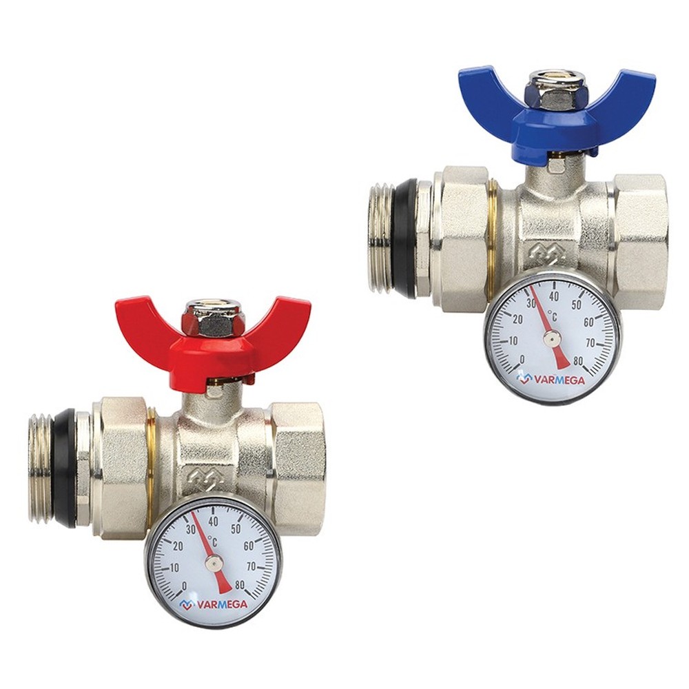 Комплекты прямых/угловых кранов Varmega с разъемным соединением для коллекторных групп предназначены для подключения и быстрого перекрытия потока на коллекторных группах систем отопления. Краны шаровые относятся к запорной арматуре и не предназначены для регулирования потока. В комплект входят два крана с красной и синей ручками. Кран с красной ручкой устанавливается на линию подачи, а кран с синей ручкой – на обратную линию.