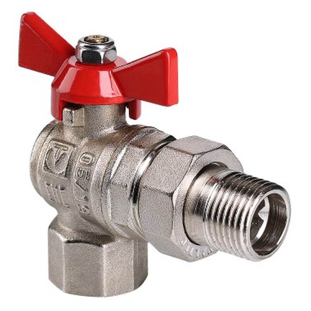 (VT.228.N) Угловой полнопроходной ремонтопригодный шаровой кран с увеличенным ресурсом. Соединен накидной гайкой с резьбовым полусгоном. Корпуса деталей – латунные, никелированные. Кран оснащен ручкой типа «бабочка» с утолщенной стенкой из алюминиевого сплава и эпоксидным покрытием красного цвета. Резьба присоединений – внутренняя/наружная.