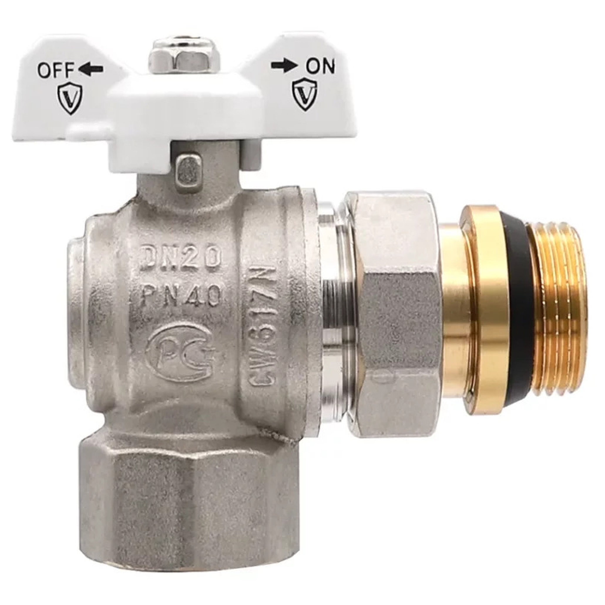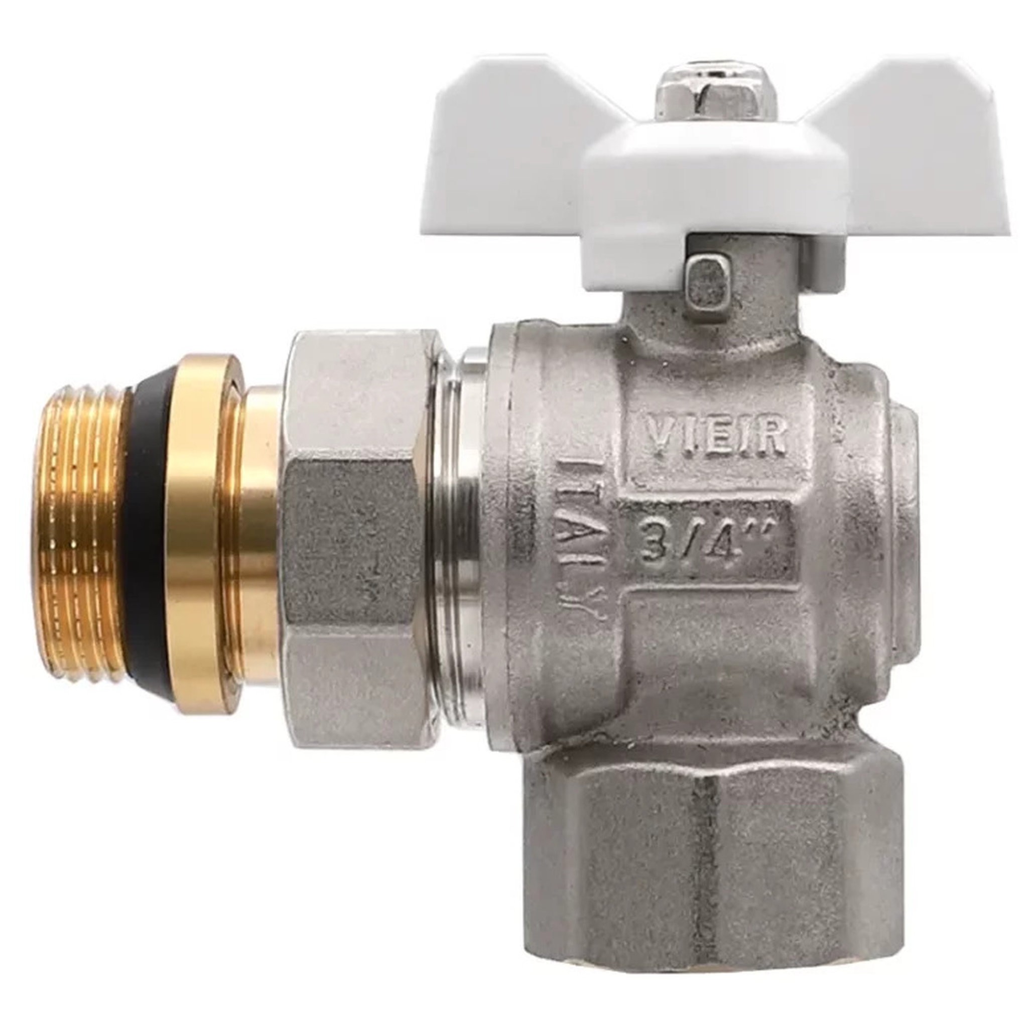 VIEIR Кран Угловой со сгоном НР-ВР 1/2" с уплотнением, бел. (VER47A). Кран с Американкой и резиновым кольцом - уплотнением отличается высокими эксплуатационными и качественными показателями. Время эксплуатации составляет 30 лет или 55000 циклов. Изделие полнопроходное и при необходимости ремонтопригодное. Запорная арматура ViEiR соответствует высоким стандартам качества, надежности и долговечности. Шаровой кран используют в качестве запорной арматуры в трубопроводах холодного и горячего водоснабжения. Кран снабжен удобной ручкой-бабочкой белого цвета и подходит для установки в труднодоступные и места с ограниченным пространством.
