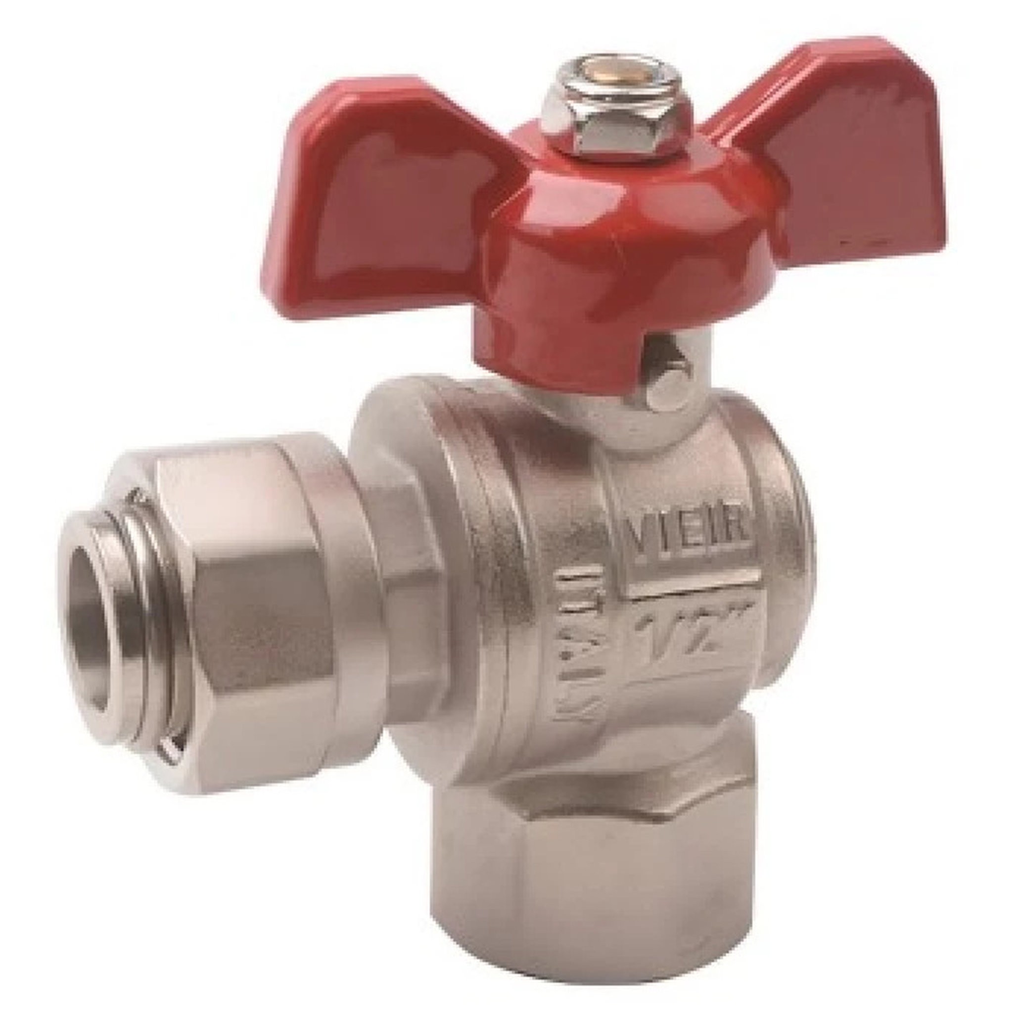 ViEiR Кран шаровой угловой с накидной гайкой бабочка 1/2" (112/14) VERS52. Кран отличается высокими эксплуатационными и качественными показателями. Время эксплуатации составляет 30 лет или 55000 циклов. Изделие полнопроходное и при необходимости ремонтопригодное.