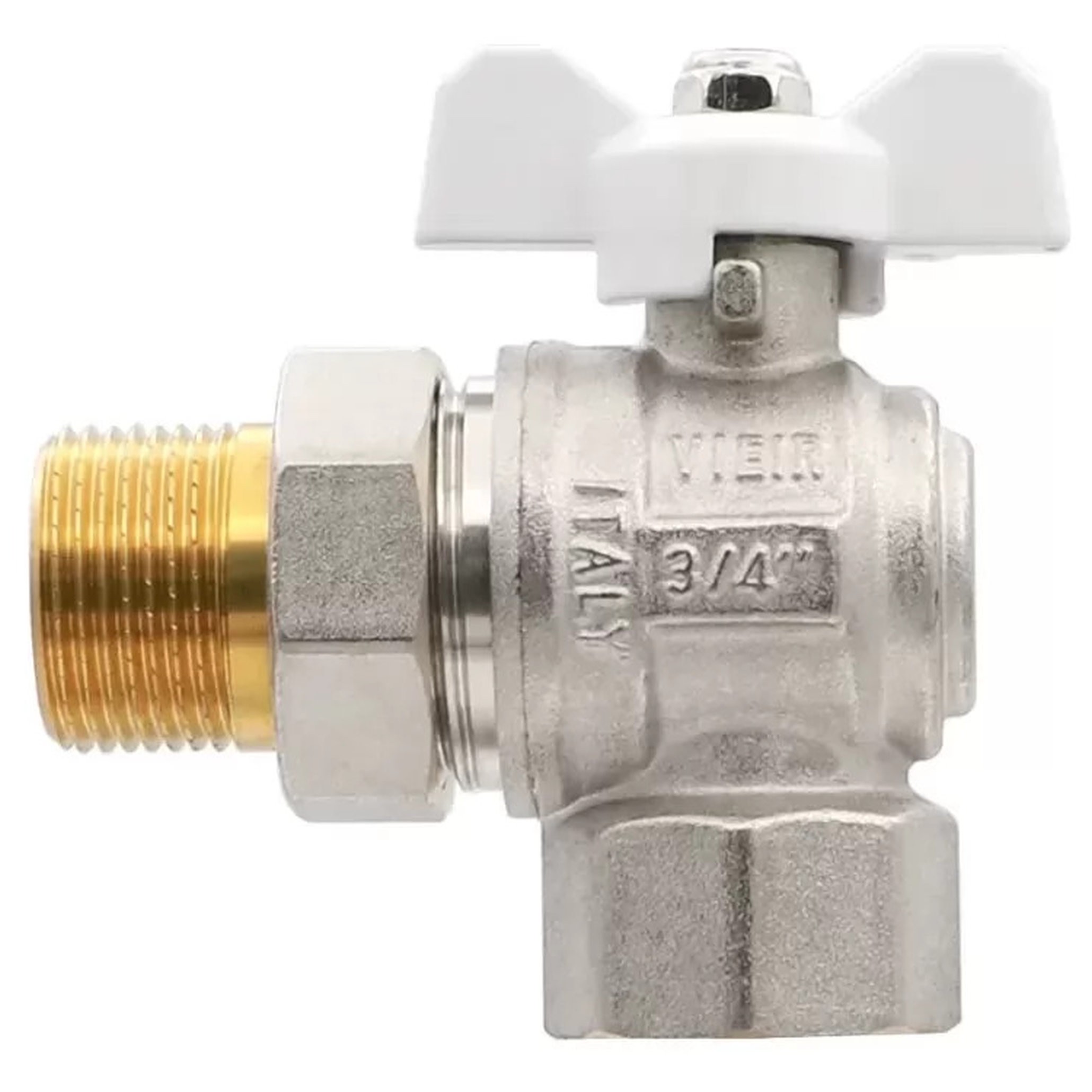 Угловой полнопроходной ремонтопригодный шаровой кран с увеличенным ресурсом. Соединен накидной гайкой с резьбовым полусгоном. Кран оснащен ручкой типа бабочка с утолщенной стенкой из алюминиевого сплава и эпоксидной покраской белого цвета. Резьба присоединений внутренняя/наружная. Соединен накидной гайкой с резьбовым полусгоном. Шаровые краны этой серии отличаются усиленным, массивным корпусом с увеличенной длиной присоединительной резьбы, что обеспечило их повышенную прочность и надежность. Увеличенная ресурсная надежность достигается за счет алмазной полировки затворного шара и последующего его хромирования (исключается прилипание инородных примесей на поверхность рабочей зоны и преждевременное изнашивание седельных уплотнительных колец), использования термостойкого тефлона со специальными эластомерными добавками, полированного и никелированного латунного штока. Отсутствует вероятность разрушения герметичности штока давлением транспортируемой жидкости, т. к. шток вставлен во внутрь корпуса. Ремонтопригодность крана обеспечивается за счет использования сменного тефлонового сальника с прижимной гайкой.