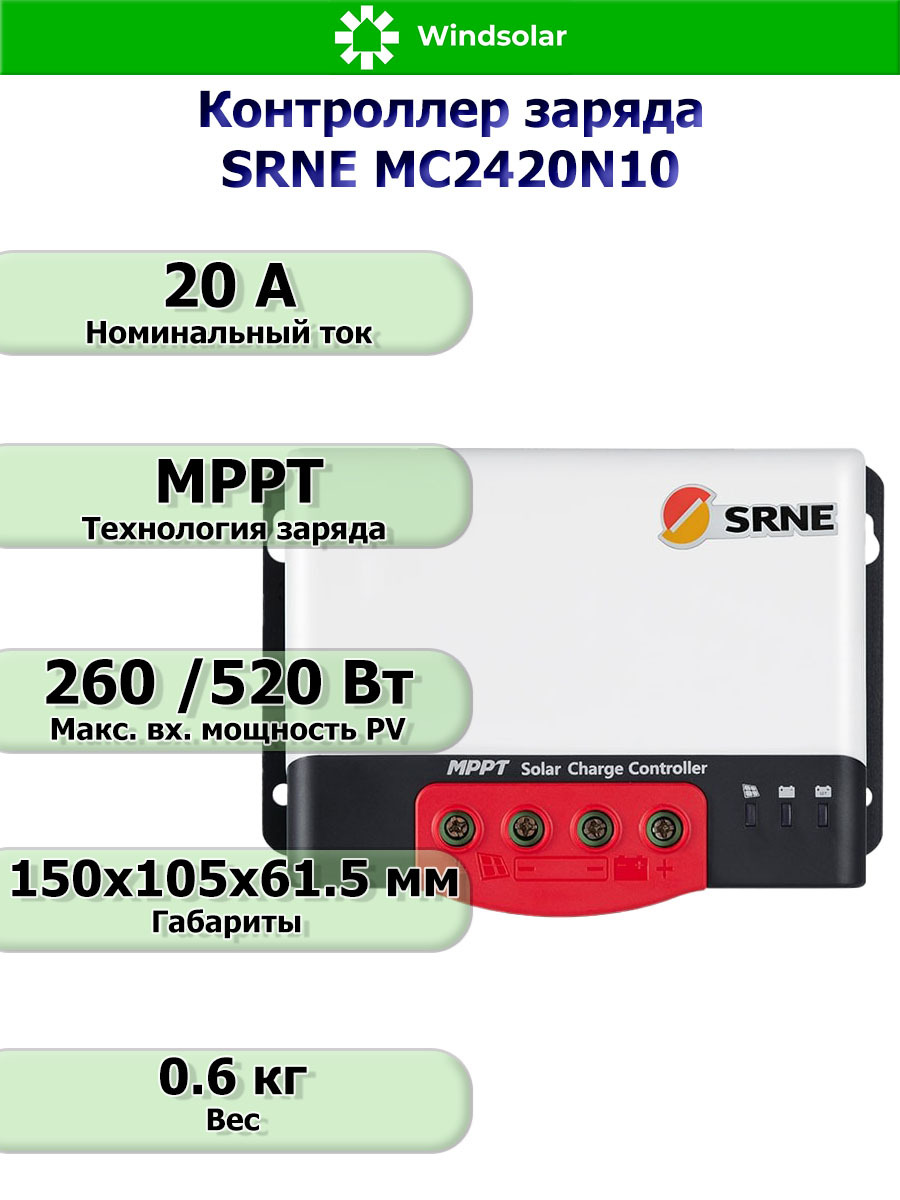 Особенности и преимущества Контроллера заряда Контроллер заряда SRNE MC2420N10 20А :